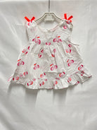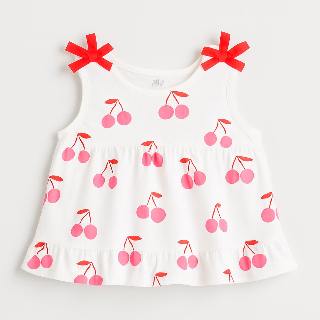 Questa adorabile canottiera bianca con stampa di ciliegie è un capo che ogni piccola dovrebbe avere nel suo guardaroba! Realizzata in un leggero cotone, offre comfort e freschezza durante le calde giornate estive. I simpatici dettagli delle ciliegie rosa e il bordo arricciato donano un tocco giocoso e vivace. Le spalline adornate con fiocchetti rossi aggiungono un ulteriore elemento di dolcezza. Perfetta per uscite al parco o festicciole estive, questa canottiera usata è in ottime condizioni e pronta per essere indossata da una piccola modaia!