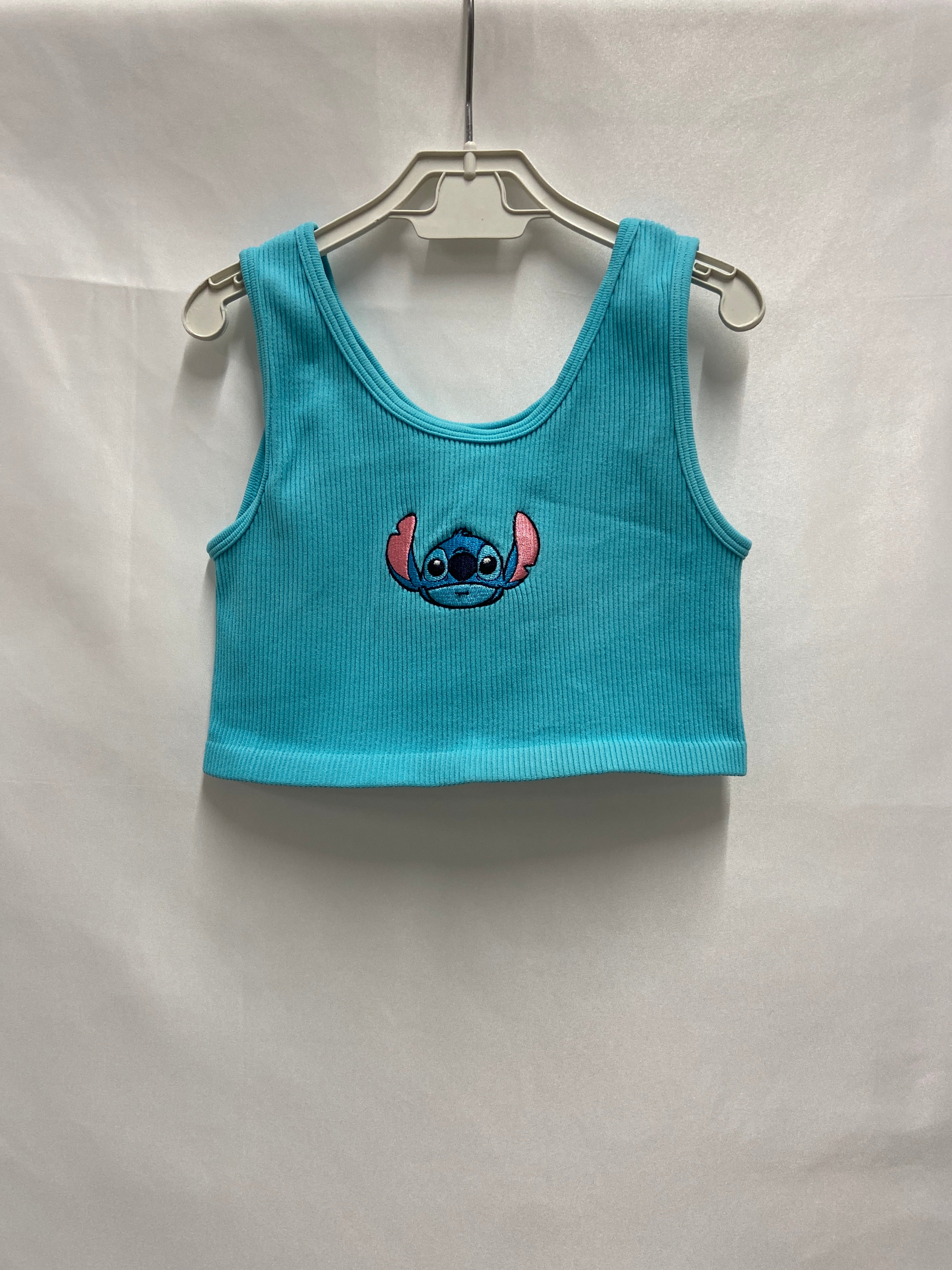 Questo adorabile crop top azzurro, ispirato al famoso personaggio Stitch, è perfetto per le piccole fan del mondo Disney! Realizzato in un morbido tessuto a costine, offre una vestibilità comoda e fresca. L’elegante ricamo di Stitch sul davanti aggiunge un tocco giocoso e unico, catturando immediatamente l’attenzione. Le spalline larghe garantiscono libertà di movimento, rendendolo ideale per giochi e avventure estive. Nonostante sia un capo usato, si presenta in ottime condizioni, pronto a colorare il guardaroba della tua piccola stilista! Un must-have per un look trendy e divertente!