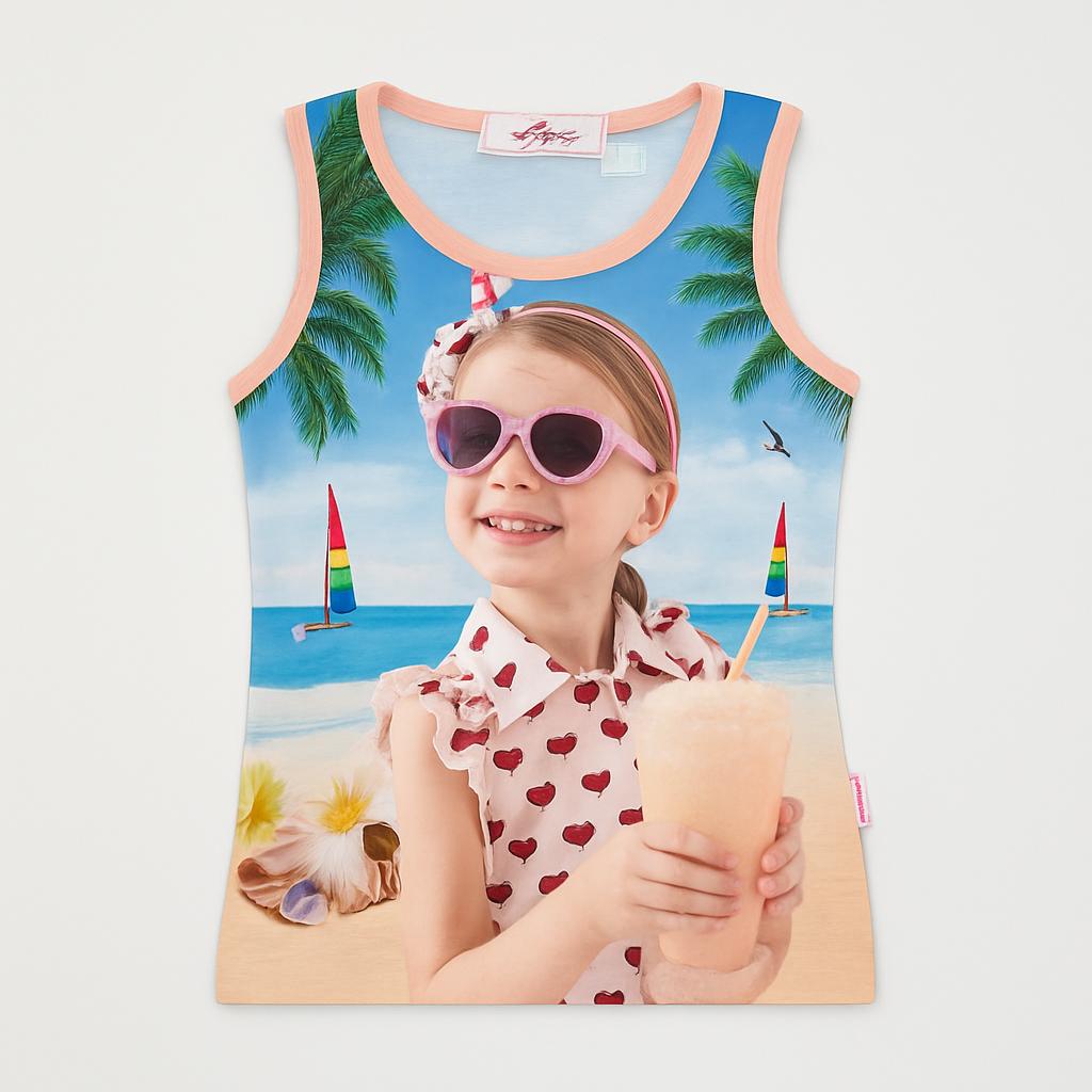 Questa graziosa canotta è perfetta per le giornate estive! Con una deliziosa stampa che ritrae una bambina sorridente davanti a un meraviglioso paesaggio marino, evoca immediatamente il divertimento e la spensieratezza delle vacanze. Le palme e le barche disegnate aggiungono un tocco tropicale, mentre le delicate rouches sulle spalle rendono il capo chic e fresco. Realizzata in morbido cotone, offre comfort per tutta la giornata. Anche se usata, è in ottime condizioni, pronta a far brillare il guardaroba delle piccole esploratrici! Un must-have per chi ama il sole e il divertimento!