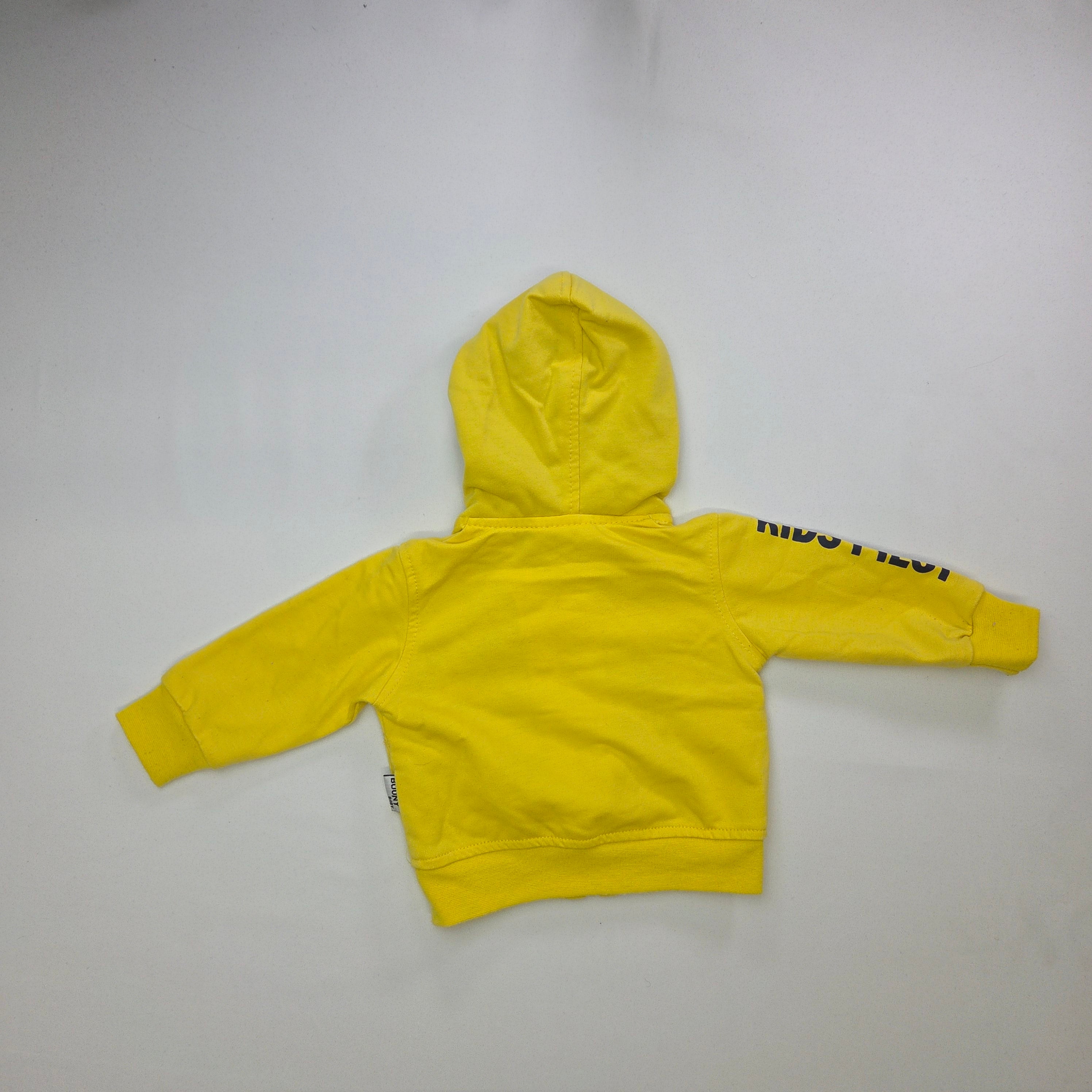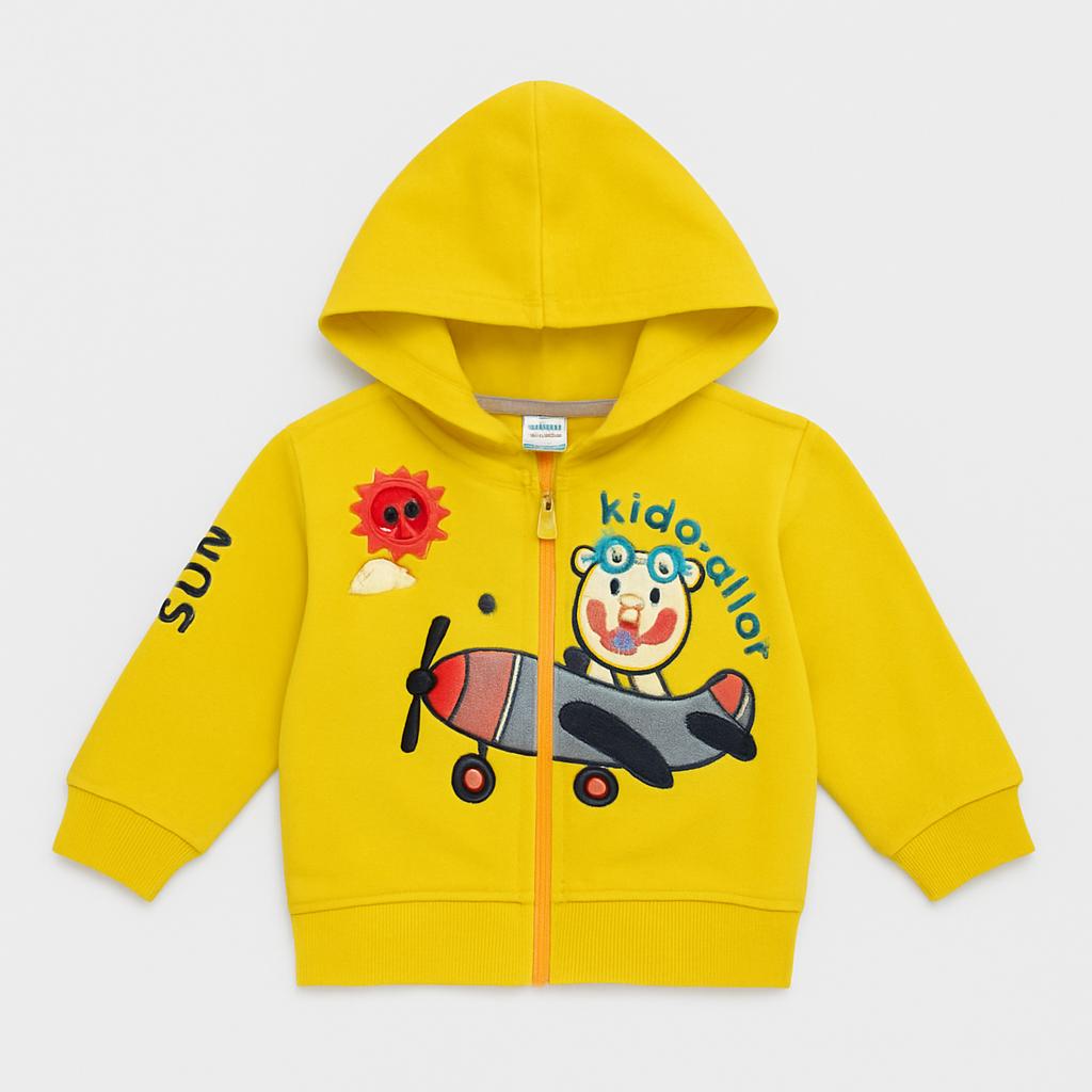 Questo adorabile giubbotto giallo per bambini è perfetto per le piccole esploratrici! Con una graziosa grafica di un aereo e un simpatico pilota orsetto, aggiunge un tocco di fantasia ai look quotidiani. Realizzato in un morbido tessuto, il maglione presenta una zip facile da usare e un cappuccio accogliente per le fresche giornate. Le maniche lunghe lo rendono adatto sia per le avventure all'aperto che per momenti di gioco in casa. Nonostante sia usato, si presenta in ottime condizioni, pronto a portare un sorriso e tanto comfort ai più piccoli! Un must-have per ogni guardaroba infantile!