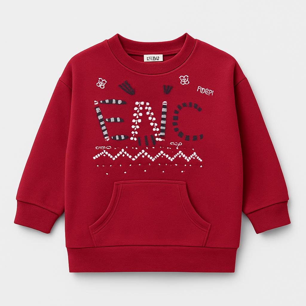 Questa simpatica felpa rossa di marca EnC è l'alleata perfetta per le fresche giornate autunnali! Realizzata in un caldo e confortevole tessuto, presenta un design vivace con dettagli colorati e glitter che catturano l'attenzione. La grande scritta "EnC" sul davanti è decorata con inserti glitterati e disegnini divertenti, donando un tocco di allegria a ogni outfit. Con una comoda tasca frontale e maniche lunghe, è ideale per giochi all'aperto o per un look casual. Nonostante sia un capo usato, si mantiene in ottime condizioni, perfetta per le piccole esploratrici pronte a vivere avventure indimenticabili!