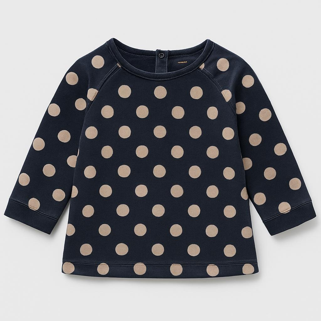 Questo adorabile pullover a maniche lunghe è perfetto per le piccole fashioniste! Realizzato in morbido tessuto, il classico fondo blu scuro è ravvivato da giocose pois beige che aggiungono un tocco di allegria e stile. Il design a raglan assicura una vestibilità comoda e una totale libertà di movimento per giocare e divertirsi. Anche se è un capo usato, si presenta in ottime condizioni, pronto per essere indossato in qualsiasi occasione. Un must-have nel guardaroba delle bambine che amano colori e comfort!