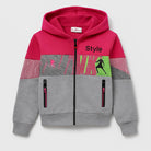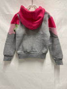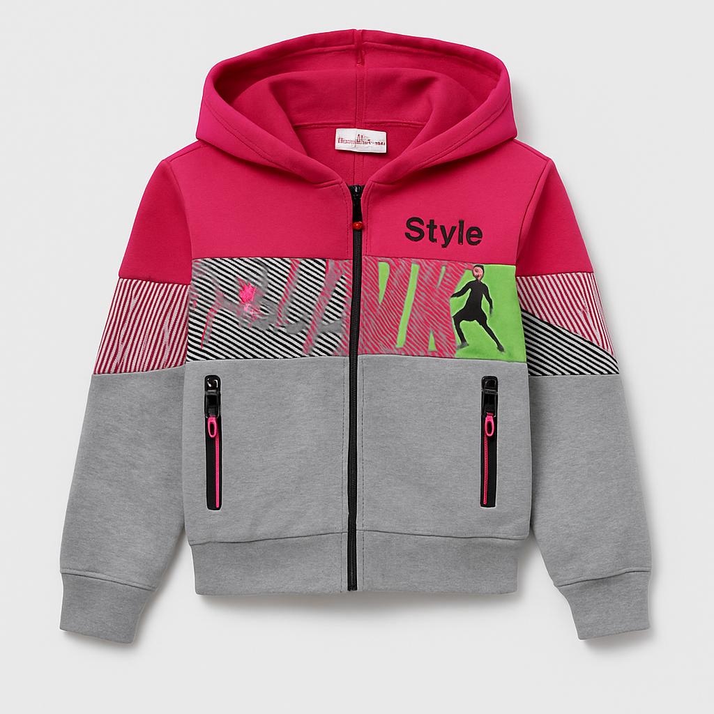 Questo splendido giubbotto sportivo in tonalità fucsia e grigia è perfetto per le piccole energiche! Con cappuccio e zip, offre comfort e stile in ogni avventura. La stampa dinamica con la scritta "RUN" e il design geometrico rende questo capo un must-have per le giovani atlete. Le tasche laterali con zip sono ideali per tenere al sicuro piccoli tesori. Nonostante sia un indumento usato, si presenta in ottime condizioni, pronto a regalare divertimento e calore durante le giornate all'aperto. Perfetto per scatenarsi in libertà!