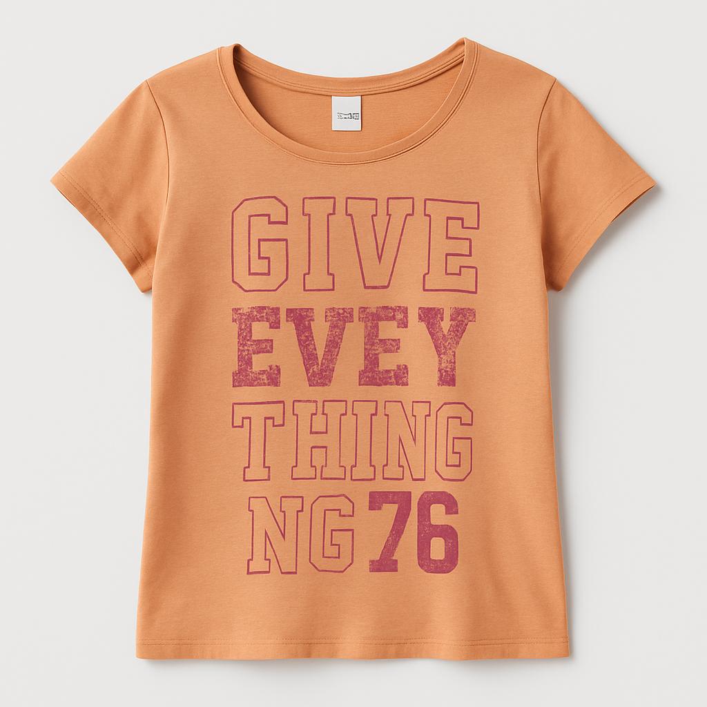 Questa adorabile t-shirt, in un caldo tono arancione, è perfetta per la tua piccola! Il messaggio "GIVE EVERYTHING" stampato in vivaci lettere rosa la rende davvero unica e motivante. Realizzata in un morbido tessuto, assicura comfort tutto il giorno, ideale per le attività all'aperto o una giornata di giochi. Le maniche corte e il taglio leggermente oversize conferiscono un look trendy e alla moda. Nonostante sia un capo usato, si presenta in ottime condizioni, pronta per essere indossata e far brillare il guardaroba della tua piccola!