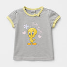 Questa adorabile t-shirt grigia con dettagli in giallo è un vero gioiello per le piccole fashioniste! Caratterizzata da un dolce design con Tweety, la maglietta cattura subito l'attenzione. Le maniche corte e le finiture colorate la rendono perfetta per le calde giornate estive e i giochi all'aperto. Il morbido cotone assicura comfort e libertà di movimento, mentre il tenero messaggio “Baby” aggiunge un tocco affettuoso. Nonostante sia un capo usato, si presenta in ottime condizioni, pronto a far brillare il guardaroba della tua bimba! Un must-have per ogni piccola amante dei personaggi dei cartoni!