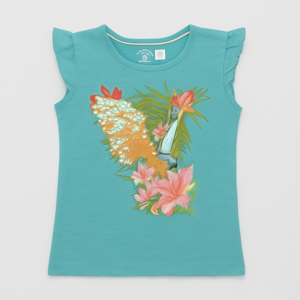 Aggiungi un tocco di freschezza al guardaroba della tua bambina con questa splendida t-shirt di colore azzurro! Caratterizzata da un design vivace con una decorazione floreale e un meraviglioso uccellino dai colori brillanti, riempie di allegria ogni outfit. Le maniche a volant conferiscono un pizzico di dolcezza, perfetto per ogni piccola fashionista. Realizzata in un cotone morbido, assicura comfort e libertà di movimento per le giornate di gioco. Pur essendo un capo usato, si presenta in ottime condizioni, pronta per nuove avventure!