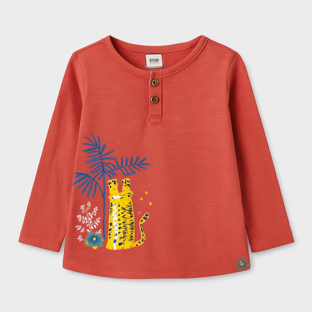 Questa adorabile maglietta a maniche lunghe di colore corallo è perfetta per i piccoli esploratori! Realizzata in un morbido cotone, offre comfort e calore per le fresche giornate d’autunno. Sul lato, un simpatico tigrotto tra le foglie tropicali aggiunge un tocco di avventura e fantasia. I bottoncini sul collo donano un dettaglio pratico e carino. Nonostante sia usata, la maglietta è in ottime condizioni e pronta a vivere nuove avventure! Un capo ideale per chi ama giocare con stile!