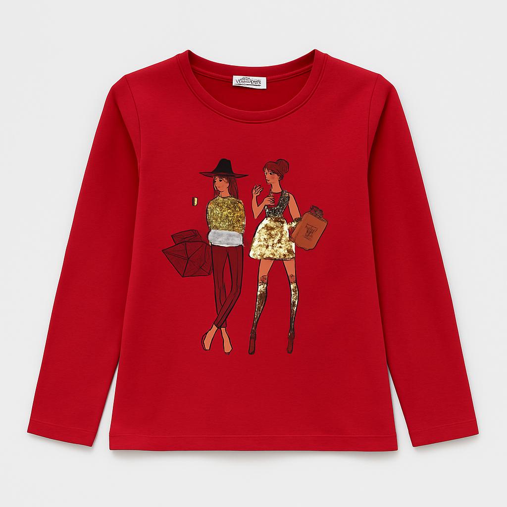 Questa bellissima maglietta rossa a maniche lunghe è perfetta per le piccole fashioniste! Con un vivace design che ritrae due ragazze stilose pronte per un pomeriggio di shopping, cattura subito l'attenzione. I dettagli in paillettes oro lucido rendono il tutto ancora più speciale, aggiungendo un tocco di brillantezza al look. Realizzata in morbido cotone, garantisce comfort e libertà di movimento. Anche se è un capo usato, si presenta in ottime condizioni, pronta per accompagnare la tua bambina in numerose avventure! Un must-have per ogni guardaroba!