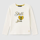 Questa adorabile maglietta a maniche lunghe è perfetta per le fredde giornate d'autunno! Realizzata in morbido cotone bianco, offre comfort e versatilità. Sul fronte, una scritta “Still ♥ You” è accompagnata da un grazioso cuore a scacchi gialli, che aggiunge un tocco di colore e allegria. Il taglio morbido e le maniche lunghe la rendono ideale per un look casual, perfetto per la scuola o i giochi con gli amici. Anche se è un capo usato, si presenta in ottime condizioni, pronto per diventare il preferito della tua piccola!
