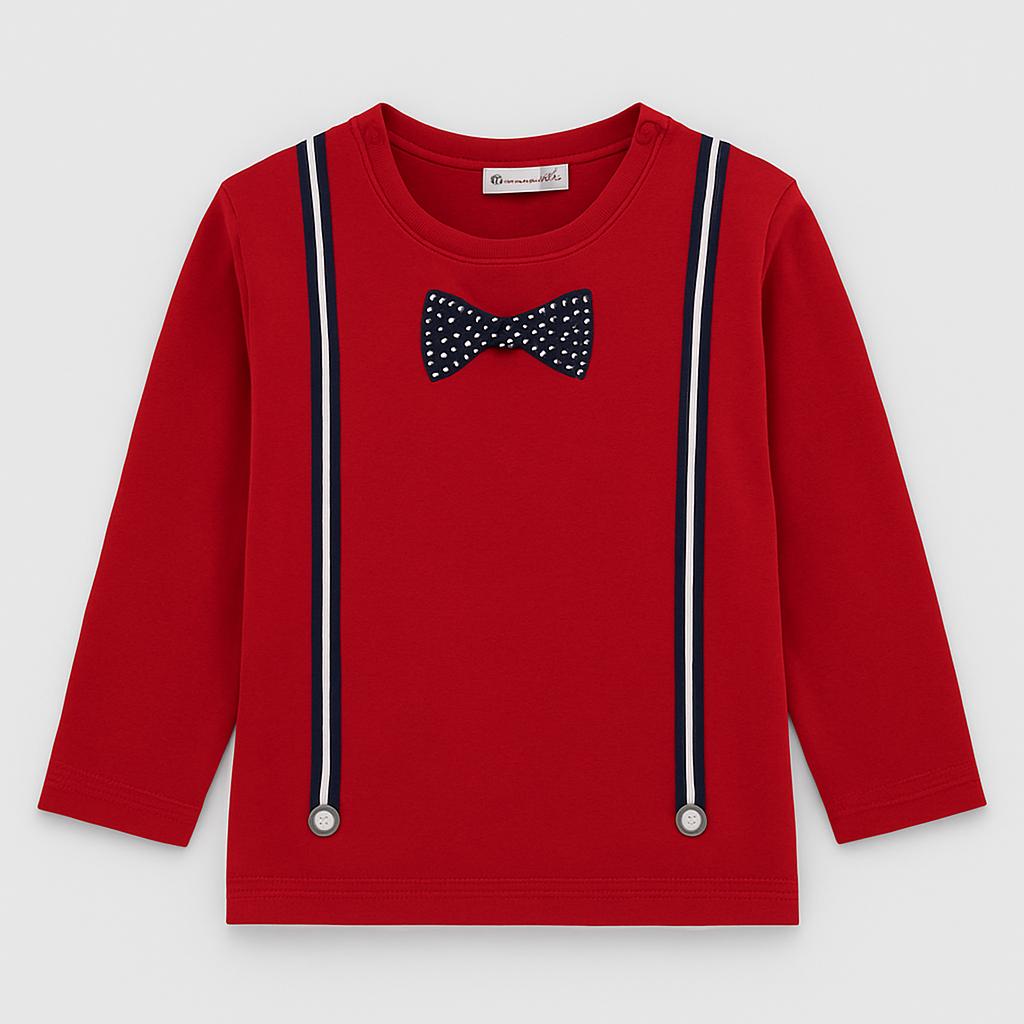 Questa simpatica maglietta rossa porterà un sorriso sul viso del tuo piccolo! Realizzata in un morbido cotone, è decorata con un delizioso papillon a pois sul petto che aggiunge un tocco di eleganza. Le divertenti bretelle a righe bianche e nere donano un'aria giovanile e briosa, perfetta per qualsiasi occasione. Con maniche lunghe e un taglio comodo, è l'ideale per le giornate fresche o per una serata speciale. Nonostante sia un capo usato, si presenta in ottime condizioni ed è pronta per accompagnare il tuo bambino in nuove avventure!