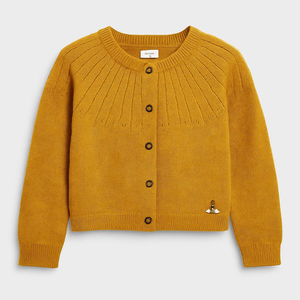 Questo adorabile cardigan in un caldo color senape è l’aggiunta perfetta al guardaroba della tua bimba! Realizzato in morbido filato, offre comfort e stile. La lavorazione a coste e i bottoni in legno sulla parte frontale donano un tocco rustico e chic. Ideale da indossare sopra una T-shirt o un vestito, è perfetto per le fresche giornate autunnali. Nonostante sia un capo usato, si presenta in ottime condizioni, pronto a essere protagonista in ogni outfit! Un must-have per le piccole fashioniste che amano essere sempre eleganti e coccolate!