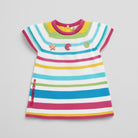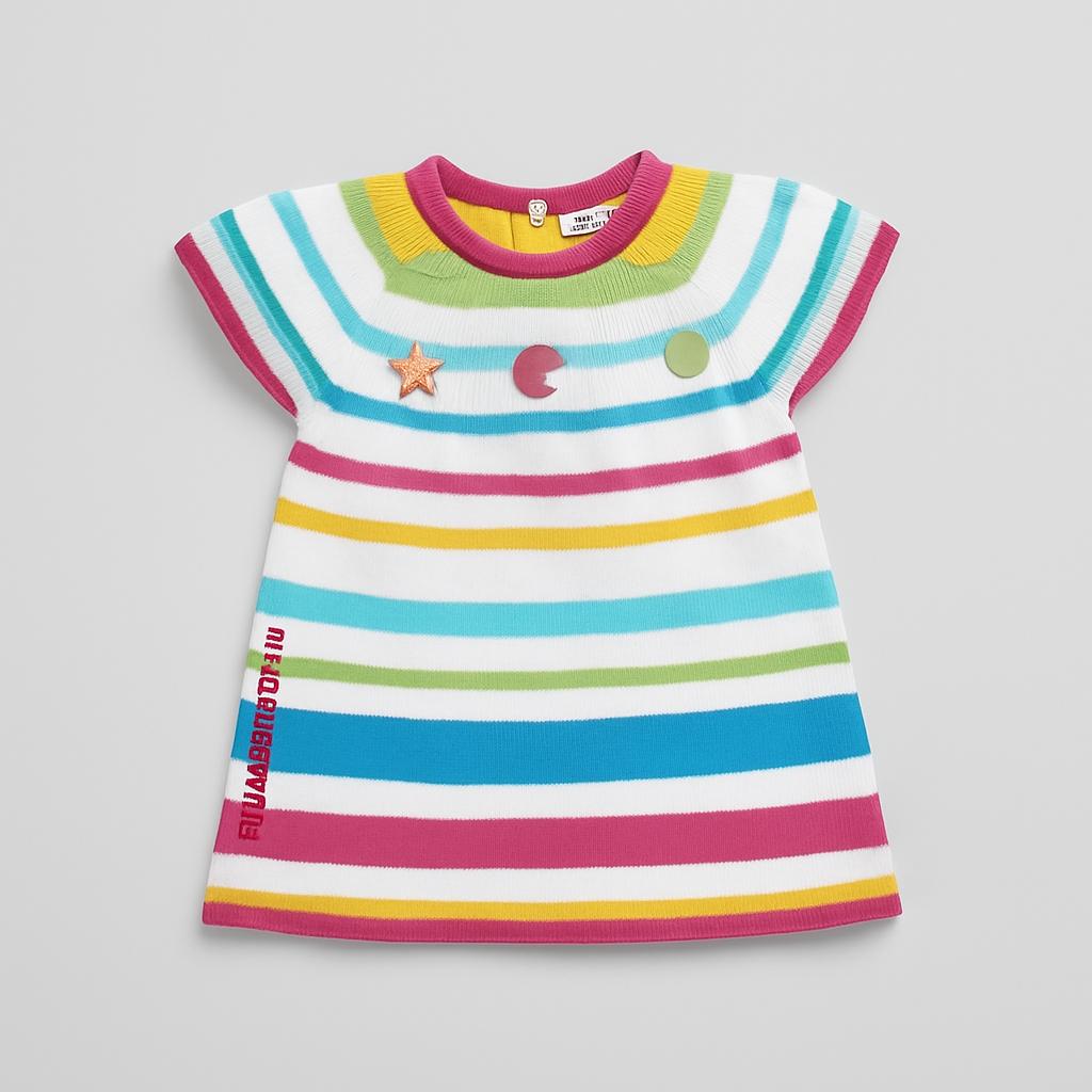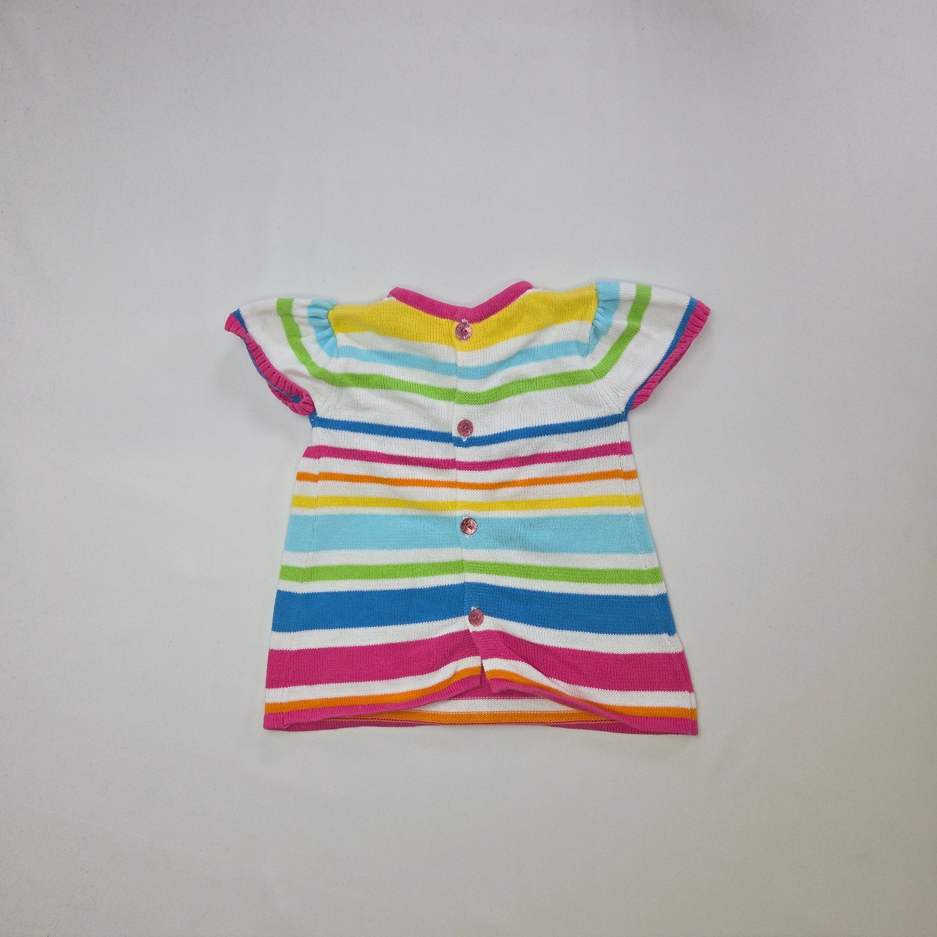 Questa adorabile maglietta a righe multicolori è il pezzo ideale per il guardaroba della tua piccola! Realizzata in un morbido e confortevole tessuto, la maglietta presenta un vivace mix di colori che porta allegria. Le righe orizzontali in tonalità pastello si abbinano perfettamente al colletto e ai dettagli a contrasto, rendendola un capo trendy e spensierato. Decorazioni divertenti, come stelle e bottoni colorati, aggiungono un tocco ludico e originale. Perfetta per le giornate di sole o per giocare con gli amici, questa maglietta usata è in buone condizioni e pronta a far brillare ogni outfit! Ideale per le piccole fashioniste che amano divertirsi con stile!