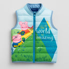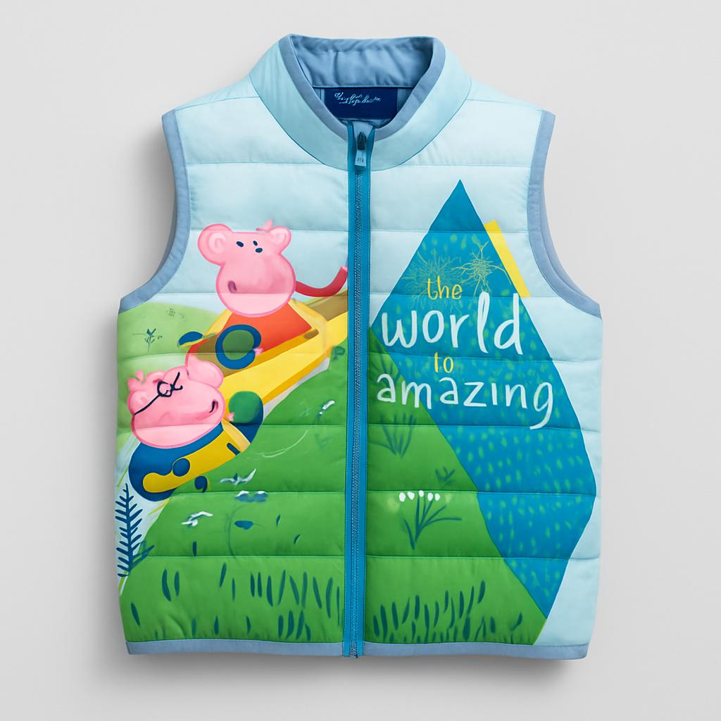 Questa dolcissima giacca smanicata di Peppa Pig farà sorridere ogni piccolo amante dell'avventura! Realizzata in morbido tessuto imbottito, presenta un vivace design blu con colorati dettagli verde e una graziosa stampa dei simpatici maialini. La scritta "The world is amazing" ispira alla scoperta e alle meraviglie della natura. Facile da indossare grazie alla zip frontale, questa giacca è perfetta per le fresche giornate primaverili, consentendo libertà di movimento per giocare liberamente. Usata ma in ottime condizioni, è un capo imperdibile per rendere ogni outing speciale e divertente!
