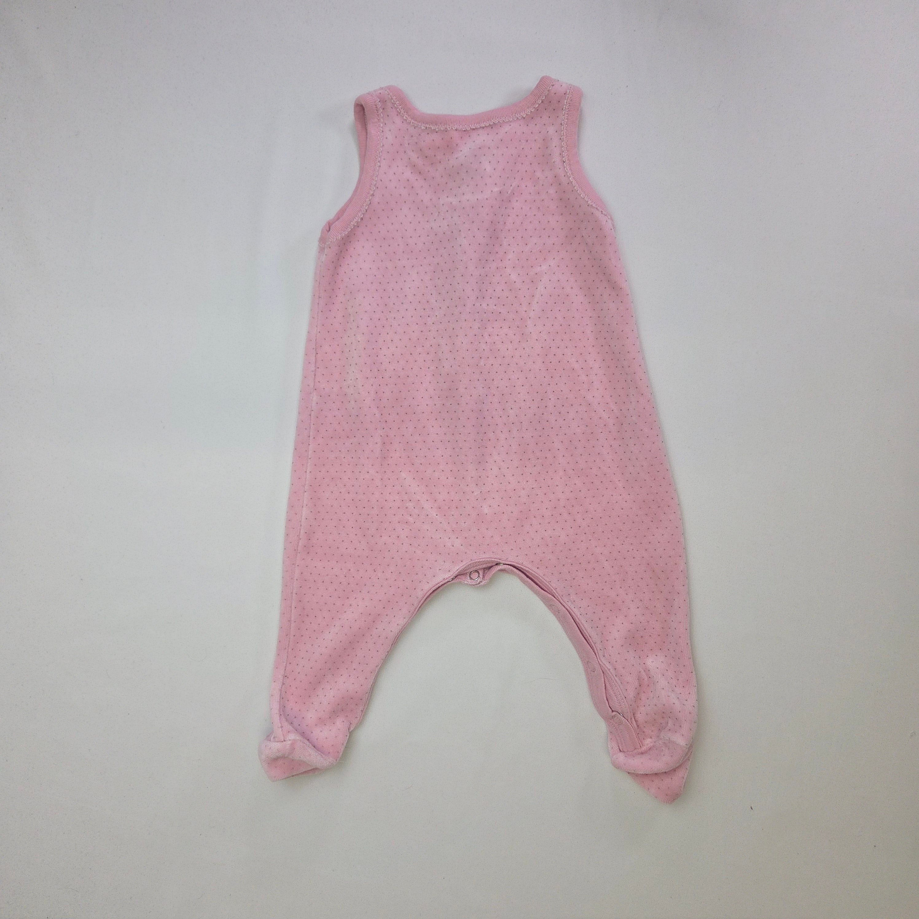 Questo adorabile pagliaccetto in morbido tessuto rosa è il sogno di ogni genitore! Con un delizioso motivo a pois, il design elegante e coccoloso farà sentire il tuo bimbo avvolto in un abbraccio. La chiusura con bottoni frontali rende il cambio pannolino un gioco da ragazzi. Le maniche corte e i piedini chiusi lo rendono perfetto per le fresche serate estive o come pigiama per notti tranquille. Anche se usato, si presenta in ottime condizioni, pronto a portare gioia e comfort al tuo piccolo! Ideal per dolci sogni e giocate in casa!