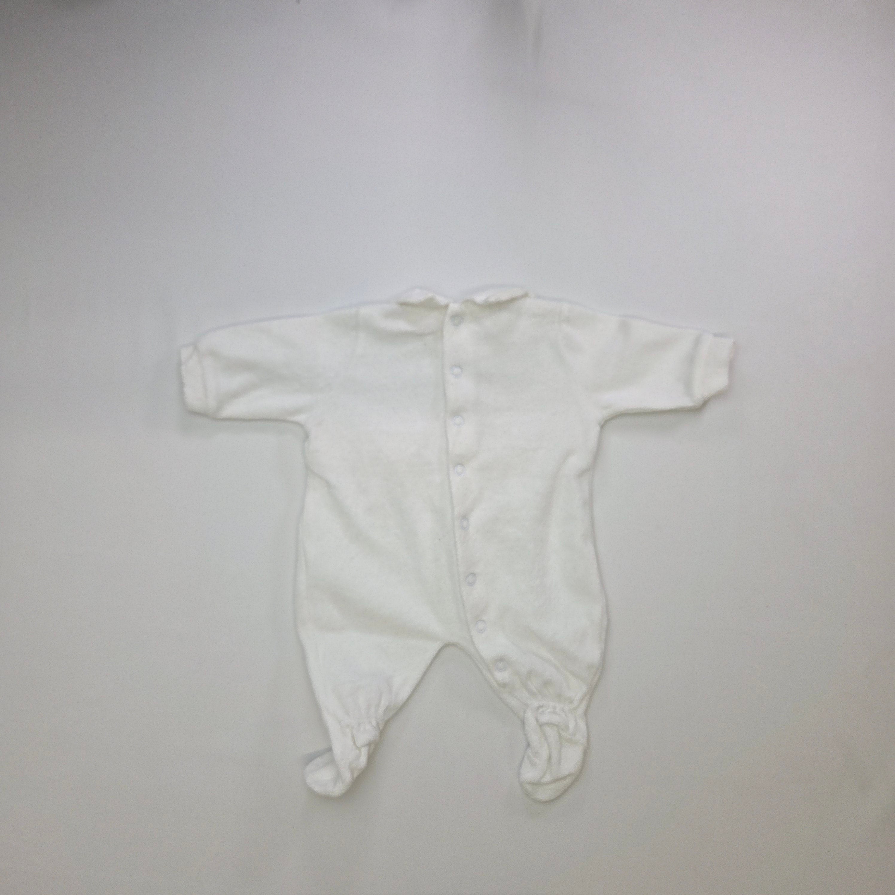 Questo adorabile pagliaccetto bianco è perfetto per il tuo piccolo tesoro! Realizzato in morbido materiale felpato, offre il massimo del comfort e della coccole. Con un elegante colletto e delicati bottoncini, aggiunge un tocco raffinato al look. Le maniche lunghe e i piedini garantiscono calore, rendendolo ideale per le giornate fresche. Nonostante sia un capo usato, si presenta in ottime condizioni, pronto per accompagnare il tuo bimbo in mille avventure. Un must per ogni neonato!