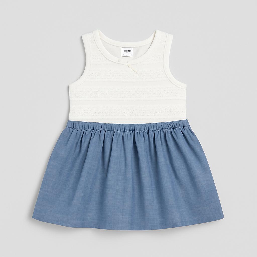 Questo adorabile vestitino è perfetto per le piccole principesse! La parte superiore, in morbidissimo cotone bianco, è delicatamente decorata con un motivo a righe e una graziosa apertura con fiocchetto. La gonna in denim blu chiaro aggiunge un tocco casual e giocoso, ideale per ogni occasione, dal gioco al parco a una festa di compleanno. Con un taglio comodo e una vestibilità facile, questo vestito usato è mantenuto in ottime condizioni, pronto per essere indossato da una nuova mini fashionista. Un capo versatile che farà strappare sorrisi e complimenti!
