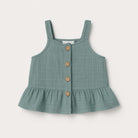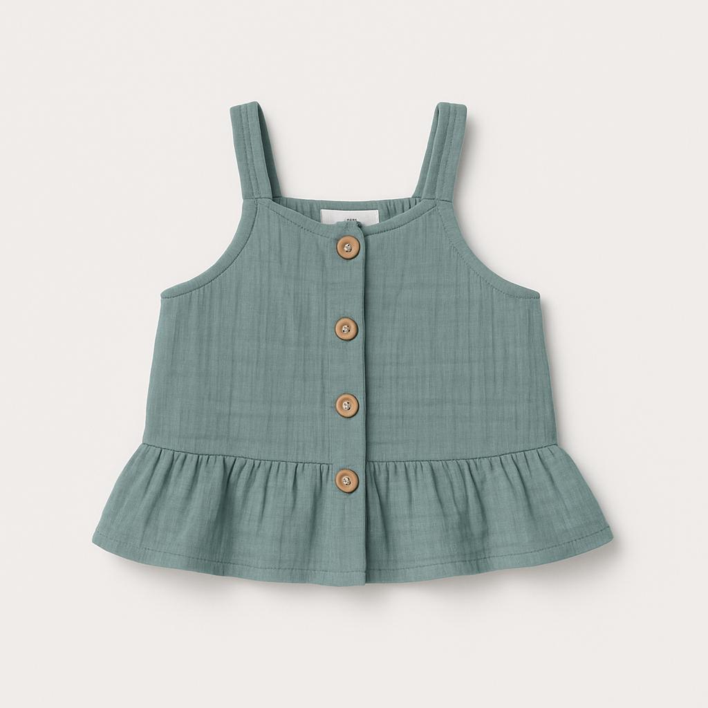 Questo adorabile top senza maniche è perfetto per le piccole fashioniste! Realizzato in morbido cotone con una deliziosa trama a trapezio, il suo elegante colore verde acqua richiama la freschezza dell'estate. Le spalline regolabili e i due bottoni sul fronte donano un tocco di stile e originalità, mentre la gonna a balze aggiunge una nota di vivacità. Ideale per le giornate di sole, questo capo usato è in ottime condizioni e pronto a far divertire la tua bambina con comfort e allegria!