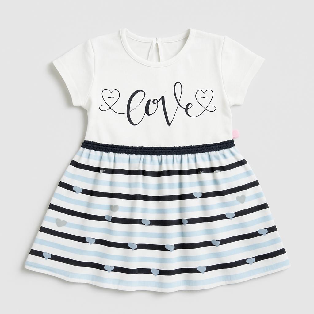 Questo adorabile vestitino bianco con gonna a righe è perfetto per le piccole sognatrici! La parte superiore presenta una dolce scritta "love" decorata con cuoricini, che irradia un messaggio di affetto. La gonna a righe blu navy e bianca, arricchita da piccoli cuori, aggiunge un tocco vivace e giocoso. Le maniche corte e il leggero abbellimento in vita rendono questo abito comodo e fresco, ideale per le giornate estive di giochi e avventure. Nonostante il passato, è in ottime condizioni, pronto a far brillare il guardaroba della tua piccola! Un must-have per ogni piccola fashionista!
