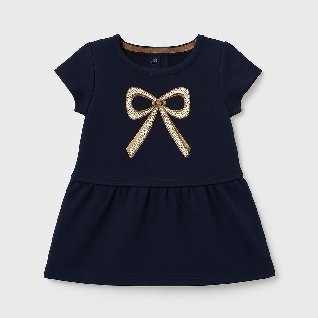 Questo adorabile vestitino di marca Old Navy è perfetto per le occasioni speciali! Realizzato in un morbido tessuto blu notte, presenta una deliziosa applicazione di un grande fiocco dorato sul petto, che aggiunge un tocco di eleganza. Le maniche corte e la gonna ampia permettono la massima libertà di movimento, rendendolo ideale per ballare e giocare. Nonostante sia un capo usato, è in ottime condizioni e pronto per far sentire una piccola principessa con stile! Un must-have per le fashioniste in erba!