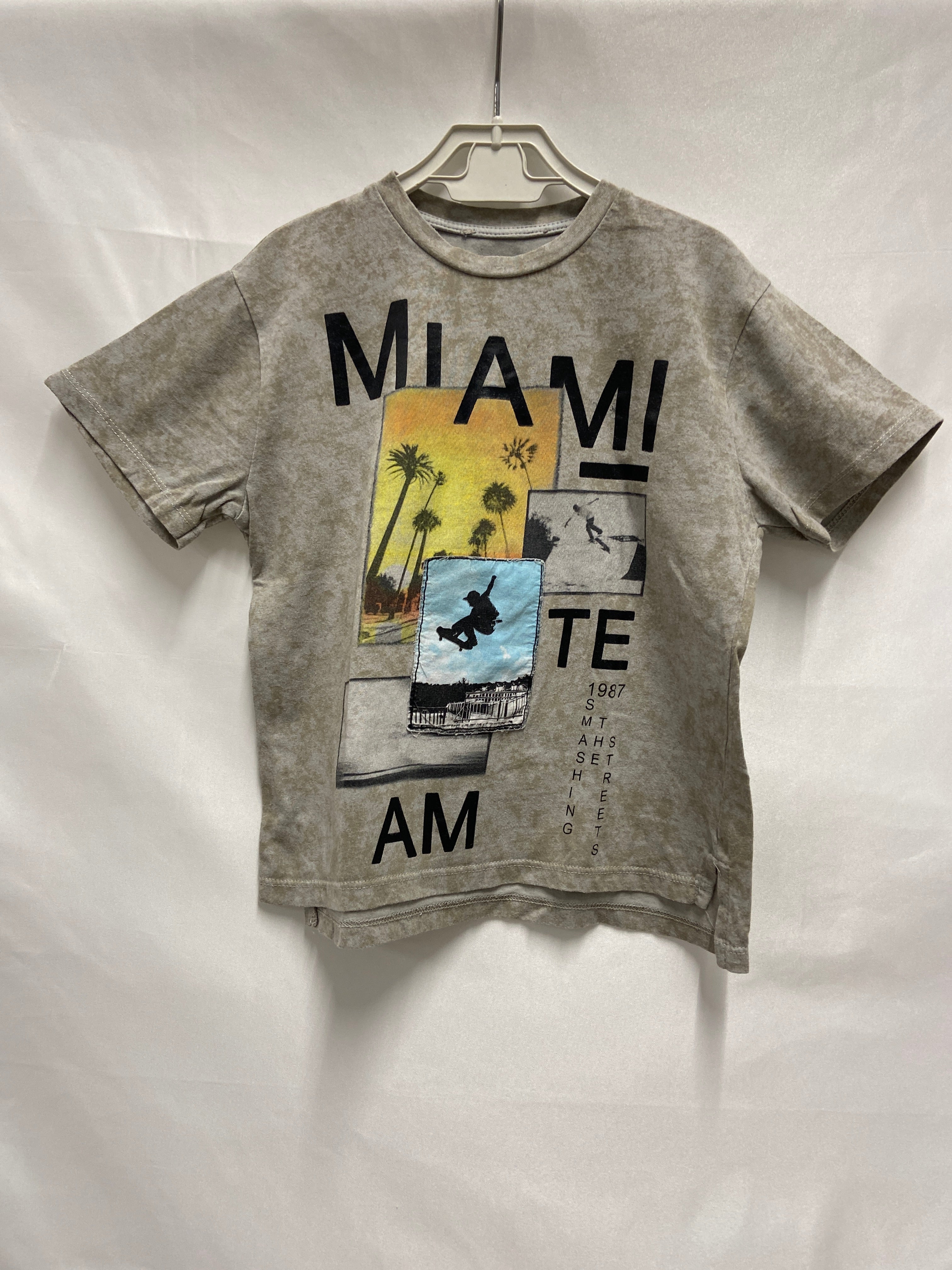 Questa originale t-shirt è un vero gioiello per i piccoli amanti della moda! Realizzata in morbido tessuto grigio chiaro, presenta un fantastico design che celebra la vivace atmosfera di Miami. La stampa colorata sul davanti include palme, un bel paesaggio marino e un tocco di avventura con un protagonista in azione. Con maniche corte e un taglio comodo, è perfetta per le giornate di sole, giochi all'aperto o semplicemente per un look trendy e casual. Anche se è un capo usato, si trova in ottime condizioni e porterà sicuramente un sorriso sul volto della tua piccola esploratrice!