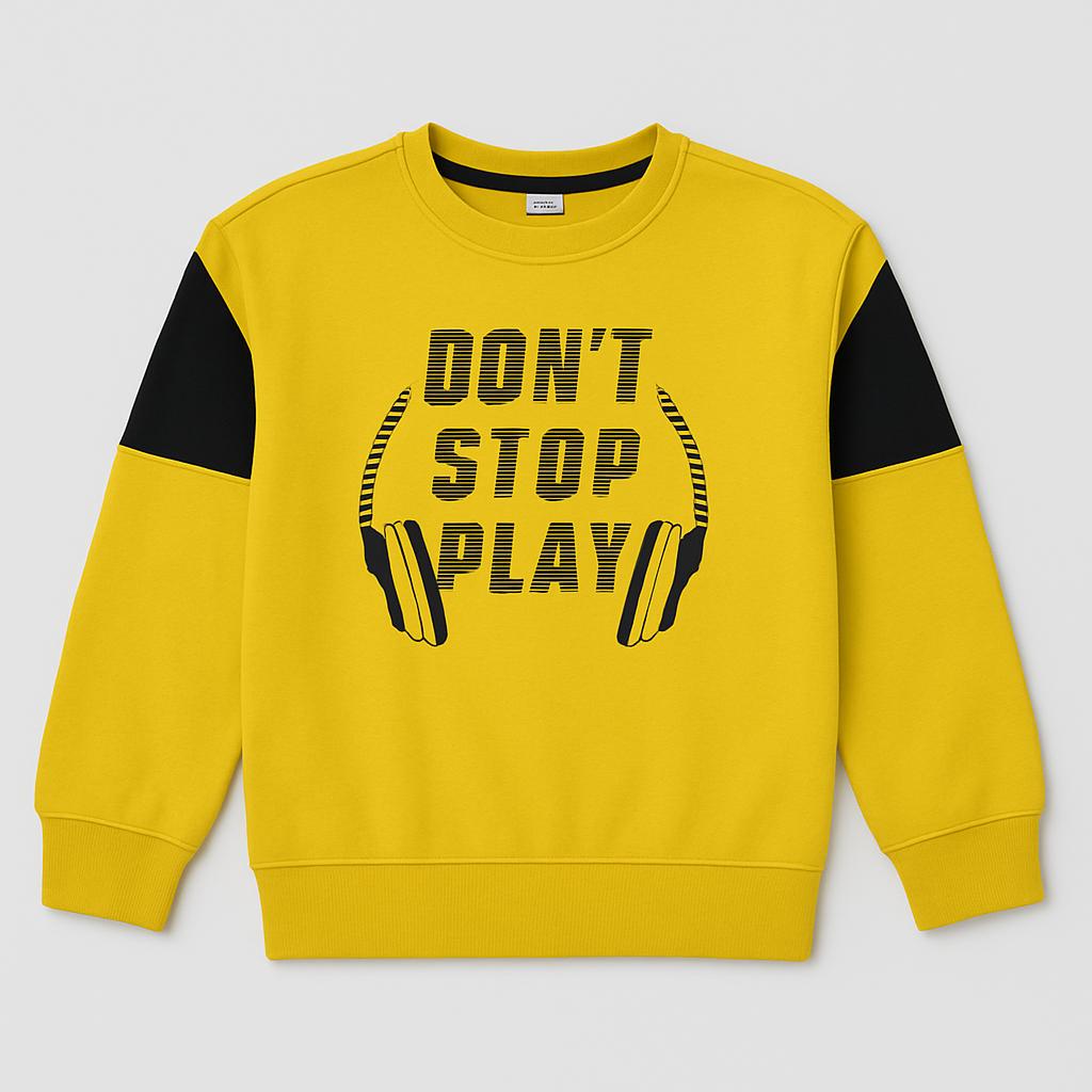 Questo vivace maglione giallo è perfetto per i piccoli amanti della musica! Con il suo design accattivante, presenta la scritta “DON'T STOP PLAY” accompagnata da cuffie, rendendolo un capo trendy e divertente. Realizzato in un morbido tessuto, offre comfort e calore per le giornate più fresche. Le maniche a contrasto neree danno un tocco di modernità, mentre il taglio comodo lo rende ideale per ogni avventura. Anche se è un capo usato, si presenta in ottime condizioni, pronto a far brillare il guardaroba del tuo piccolo! Un must-have per chi ama esprimere la propria personalità!