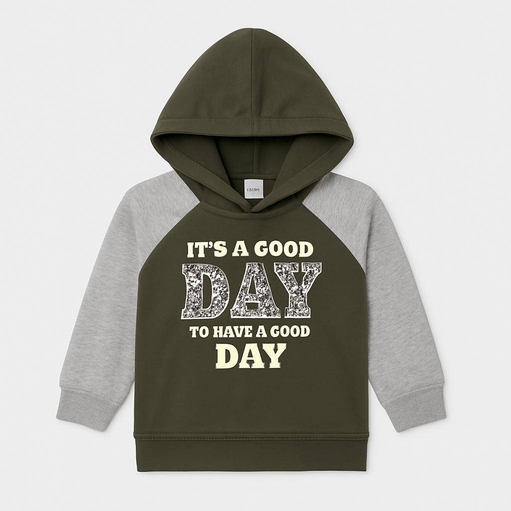 Questo delizioso felpa con cappuccio, in tonalità verde oliva, è il capo perfetto per le giornate fresche! Con maniche grigie a contrasto, è caratterizzata da una scritta divertente “IT'S A GOOD DAY TO HAVE A GOOD DAY”, che trasmette positività. Realizzata in un morbido tessuto, offre comfort e calore, ideale per giochi all'aperto o semplici momenti di relax. Nonostante sia usata, si presenta in ottime condizioni ed è pronta a creare nuovi ricordi. Un must-have per ogni piccolo esploratore!