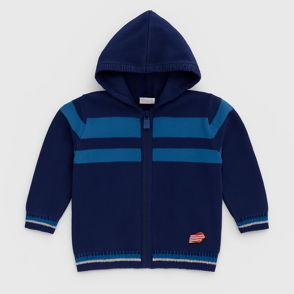 Questo adorabile cardigan blu con cappuccio è perfetto per le avventure dei più piccoli! Realizzato in un caldo cotone, presenta un design sportivo con belle bande blu e verde che aggiungono un tocco di vivacità. La zip frontale rende facile indossarlo e sfilarlo, mentre i polsini a righe mantengono le maniche ben ferme. Nonostante i segni del tempo, si trova in ottime condizioni e sarà l'ideale per le fresche giornate primaverili o le serate estive. Un capo versatile e alla moda per ogni bimbo che ama esplorare il mondo!