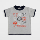 Questo adorabile t-shirt grigia è perfetta per i piccoli amanti degli animali! Con un design vivace che mostra simpatici animali disegnati a mano, porterà un sorriso sul volto di ogni bambino. Le tonalità di rosso e blu utilizzate per il testo "MY FRIENDS" aggiungono un tocco di allegria e colore. Il colletto e le maniche a contrasto danno un'aria fresca e trendy a questo capo. Realizzata in 100% cotone, è morbida e comoda, ideale per le avventure quotidiane. Nonostante sia un capo usato, si presenta in ottime condizioni, pronto per essere indossato da un piccolo esploratore!