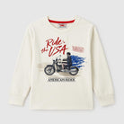 Questa originale maglietta a maniche lunghe è perfetta per i piccoli amanti delle moto! Realizzata in morbido cotone bianco, presenta un'adorabile grafica con un biker in azione e il motto "Ride in the USA". I colori vivaci e il design accattivante la rendono ideale per chi ama avventure e libertà. Il collo a giro e le maniche lunghe sono perfetti per le giornate più fresche. Nonostante sia un capo usato, è in ottime condizioni e pronta per accompagnare il tuo bambino in tantissime nuove avventure! Un capo trendy che combina comfort e stile!