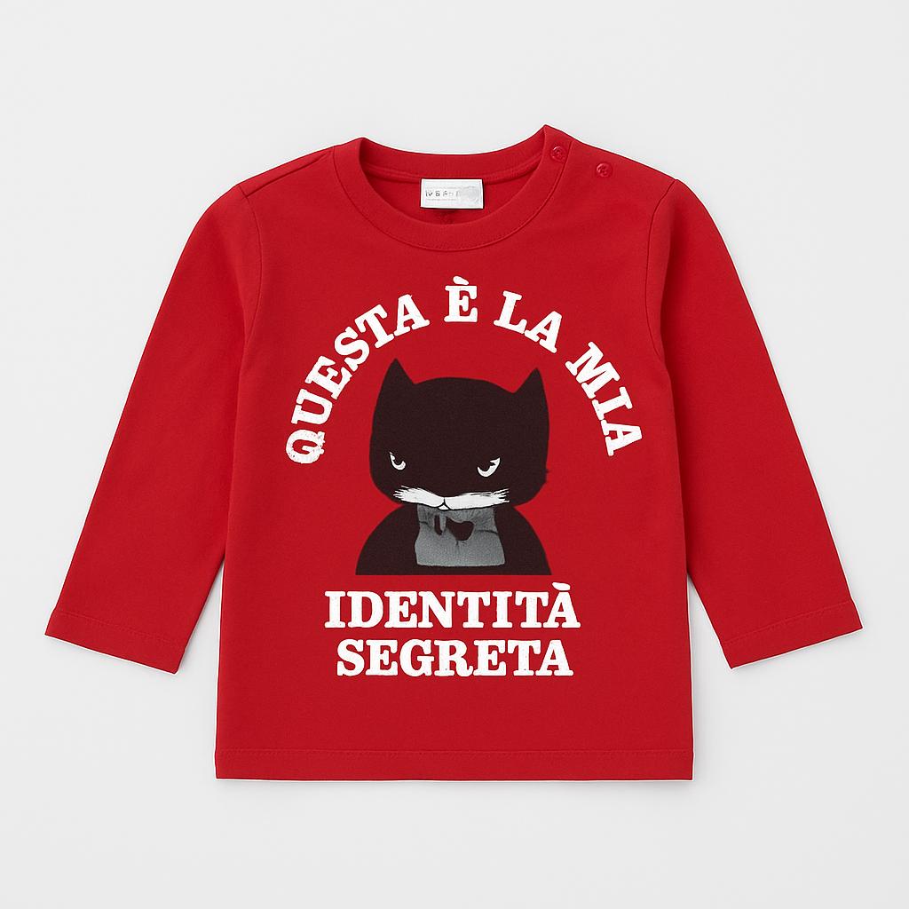 Questa simpatica maglietta rossa, perfetta per i piccoli supereroi, farà breccia nel cuore di ogni bambino! Realizzata in morbido cotone, presenta un divertente grafiche di un misterioso personaggio in maschera e la scritta "QUESTA È LA MIA IDENTITÀ SEGRETA". Le maniche lunghe garantiscono comfort e calore, rendendola ideale per le avventure quotidiane. Nonostante sia un capo usato, è in ottime condizioni e pronta a far brillare il guardaroba del tuo piccolo. Un must-have per chi ama giocare con stile!
