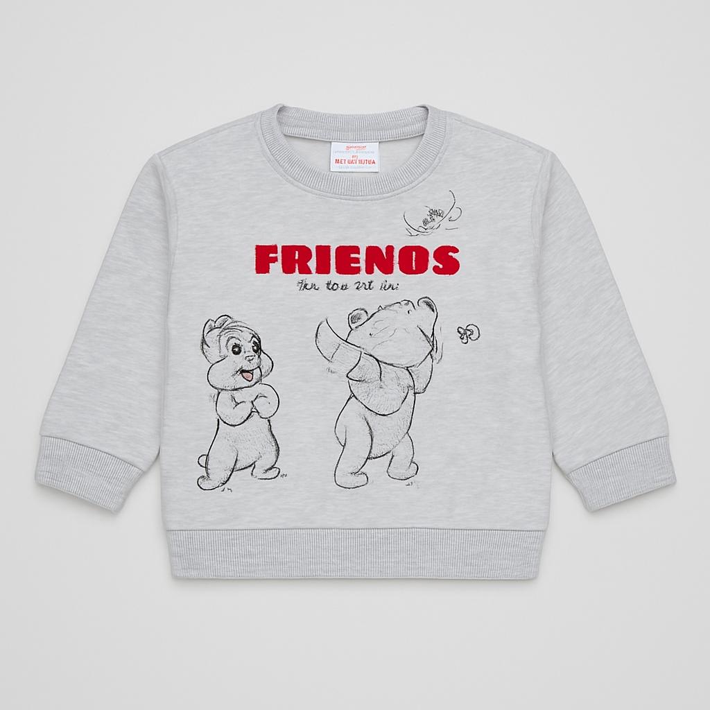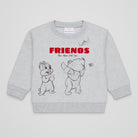Questo adorabile maglione grigio chiaro è un irresistibile passpartout per il guardaroba del tuo bambino! Decorato con un dolce disegno di due simpatici personaggi animati, evoca giochi e amicizie. La scritta “FRIENDS” in rosso vivace aggiunge un tocco di divertimento e allegria.