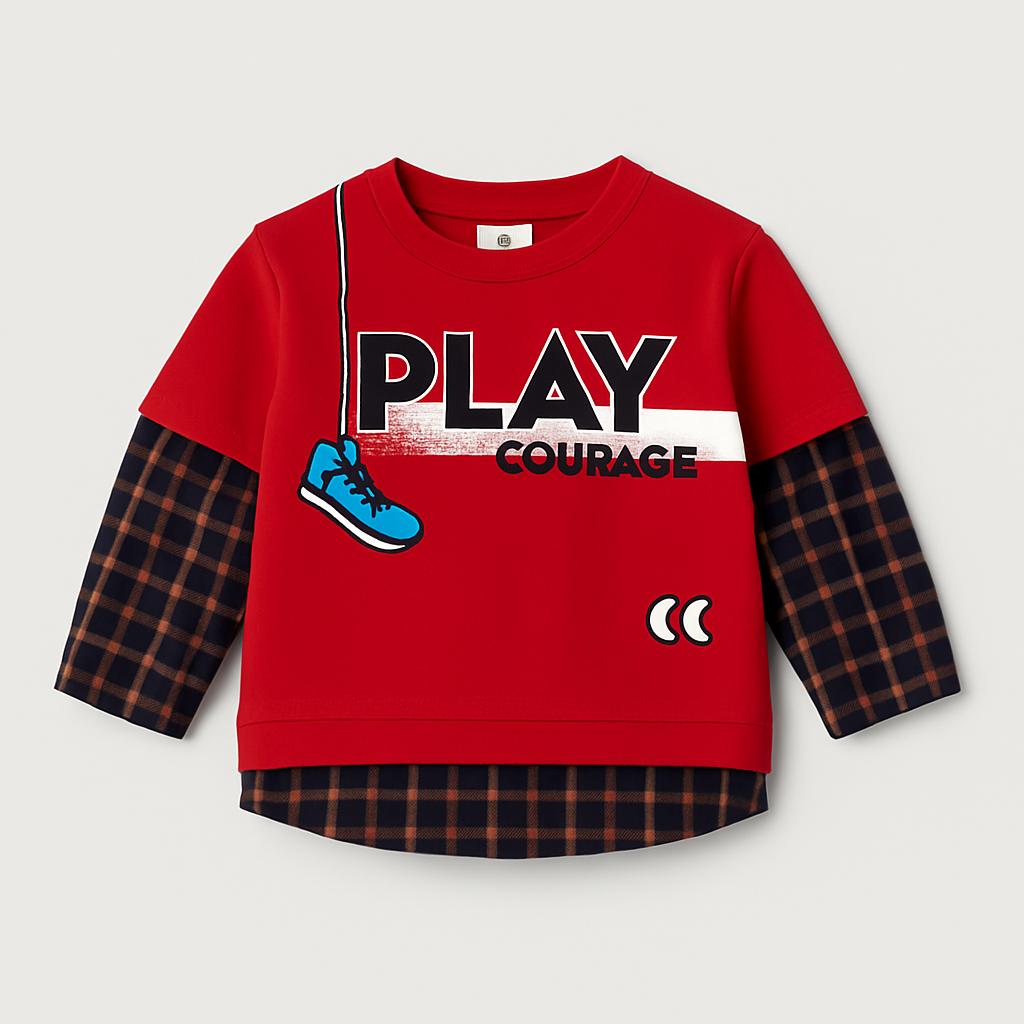Questo vivace maglione rosso è un vero e proprio invito a giocare! Con il suo design esclusivo, presenta una divertente scritta “PLAY” arricchita da un’illustrazione di scarpe sportive. Le maniche lunghe, in un classico tessuto a quadri blu e rosso, donano un tocco di stile e comfort perfetto per le giornate più fresche. Realizzato in morbido cotone, assicura una vestibilità comoda e piacevole. Nonostante sia un capo usato, è in ottime condizioni e pronto per accompagnare ogni piccola avventura di esplorazione! Un must-have per i piccoli appassionati di sport!