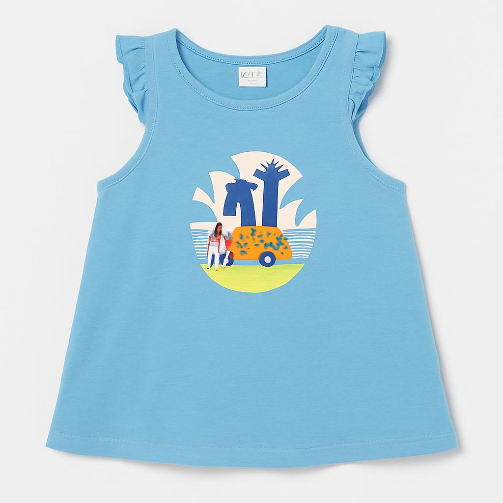 Questa deliziosa canottiera azzurra è perfetta per le giornate estive! Con delicati volant sulle spalle, aggiunge un tocco di dolcezza al look della tua bimba. La simpatica stampa al centro, che ritrae un divertente design marittimo, invita a sognare avventure in riva al mare. Realizzata in cotone morbido, è leggera e freschissima, ideale per ogni gioco e attività all'aperto. Anche se usata, si presenta in ottime condizioni, pronte per far vivere nuovi momenti di gioia! Una scelta must-have per le piccole esploratrici!