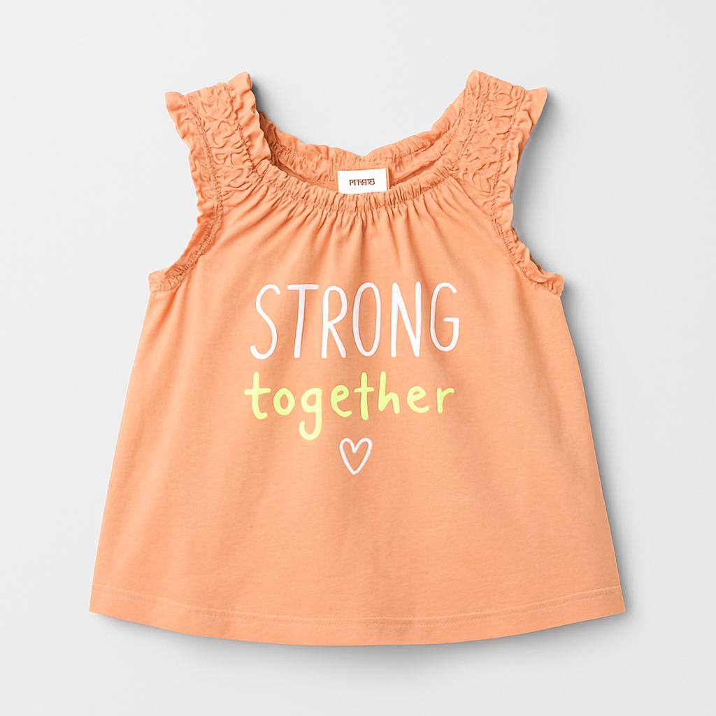Questa adorabile maglietta color pesca è perfetta per la tua piccola! Realizzata in un morbido cotone, presenta un design fresco e giocoso adornato da incantevoli rouches sulle spalle. La scritta "STRONG together" in lettere brillanti trasmette un messaggio positivo e incoraggiante. Il taglio ampio garantisce comfort e libertà di movimento, rendendola ideale per le avventure quotidiane. Nonostante sia un capo usato, si presenta in ottime condizioni ed è pronta a far brillare il guardaroba della tua bimba, perfetta per ogni occasione!