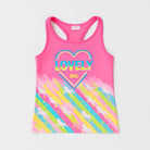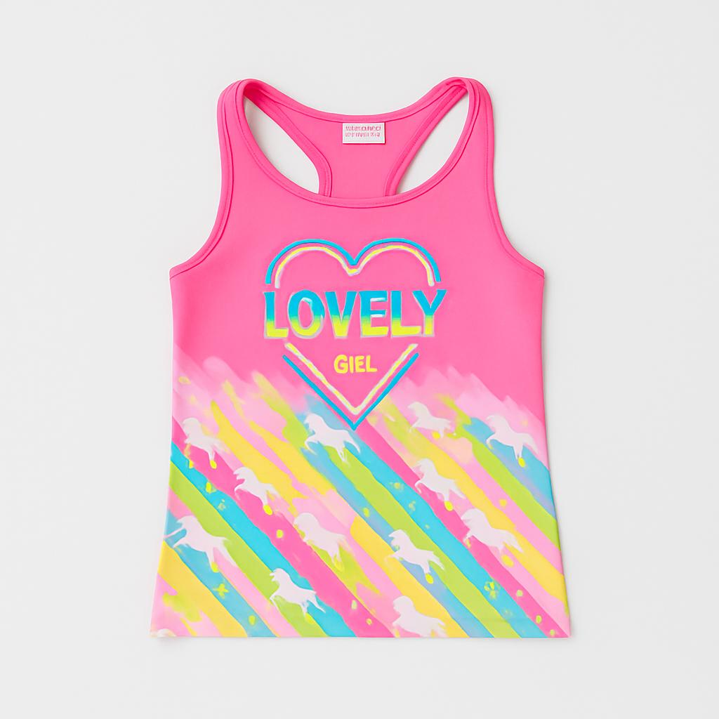 Questa vivace canotta in rosa brillante porterà un sorriso sul volto della tua piccola! Realizzata in un leggero e confortevole tessuto, la maglietta presenta una deliziosa scritta "LOVELY GIRL" adornata da un cuore glitterato. Le sfumature arcobaleno sul fondo, con adorabili unicorni e stelle, rendono questo capo irresistibile e magico. Perfetta per le giornate estive o per divertirsi in casa, è un'ottima scelta per le piccole sognatrici. Anche se è un capo usato, si trova in ottime condizioni, pronta per nuove avventure!