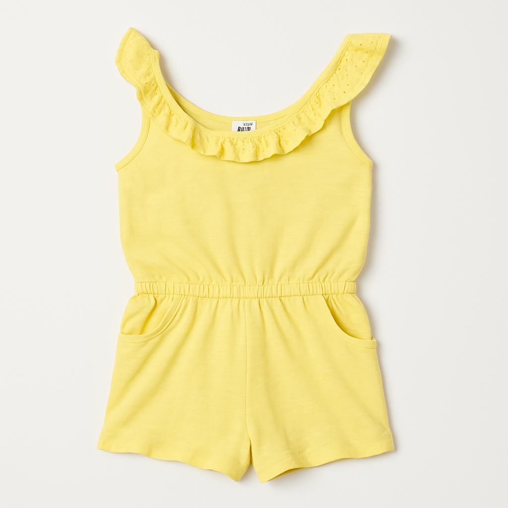 Questo adorabile salopette giallo sole è perfetto per far brillare l'estate della tua piccola! Realizzato in un fresco cotone, il suo vivace colore giallo porta allegria e spensieratezza. Il delicato ruffle sulle spalle aggiunge un tocco di femminilità, mentre la vita elasticizzata garantisce comfort durante il gioco. Con pratiche tasche sui fianchi, è ideale per riporre piccoli tesori. Nonostante sia un capo usato, si presenta in ottime condizioni, perfetto per le piccole esploratrici che amano stare alla moda, senza rinunciare alla comodità!
