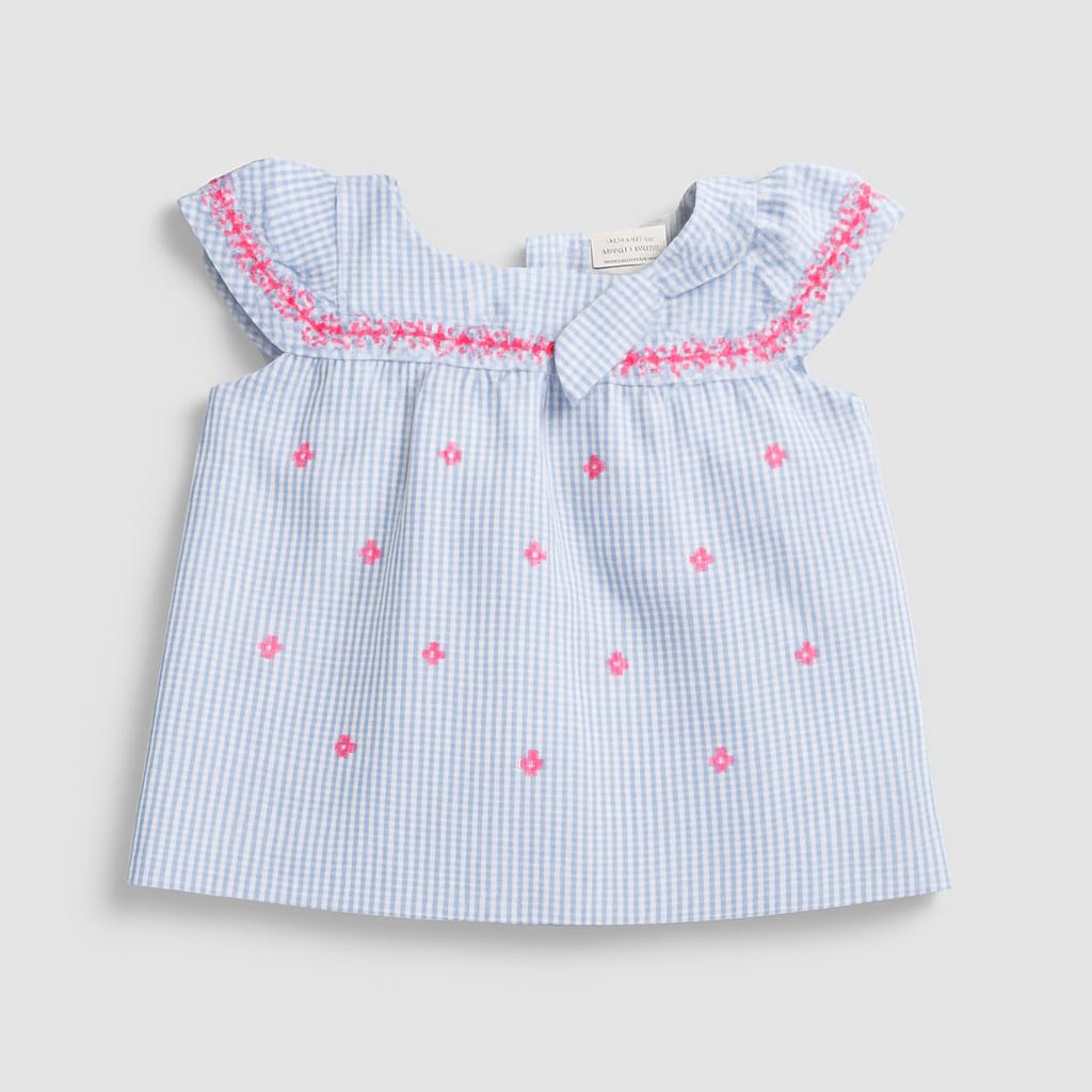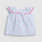 Questa deliziosa blusa a righe blu e bianche è l'ideale per le giornate soleggiate! Con adorabili ricami floreali fucsia lungo il collo e maniche a volant, aggiunge un tocco di allegria al guardaroba della tua bimba. Realizzata in cotone leggero, è comoda e fresca, perfetta per le avventure all'aperto. Nonostante sia un capo usato, mostra ancora tanta bellezza e charme. Un abito grazioso che farà brillare il sorriso della tua piccola!