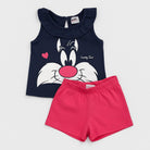 Questo adorabile completino estivo è perfetto per le piccole fan di Looney Tunes! La maglietta senza maniche, di un bel blu notte, presenta un fantastico disegno di Sylvester il gatto, con un tenero cuore rosso che cattura subito l’attenzione. Le rouches sulla scollatura aggiungono un tocco di dolcezza e femminilità. I pantaloni corti, in un vivace rosa, sono comodi e pratici, ideali per correre e giocare. Nonostante siano usati, questo set si trova in ottime condizioni e offrirà ore di divertimento e stile per la tua piccola! Un must-have per l'estate!