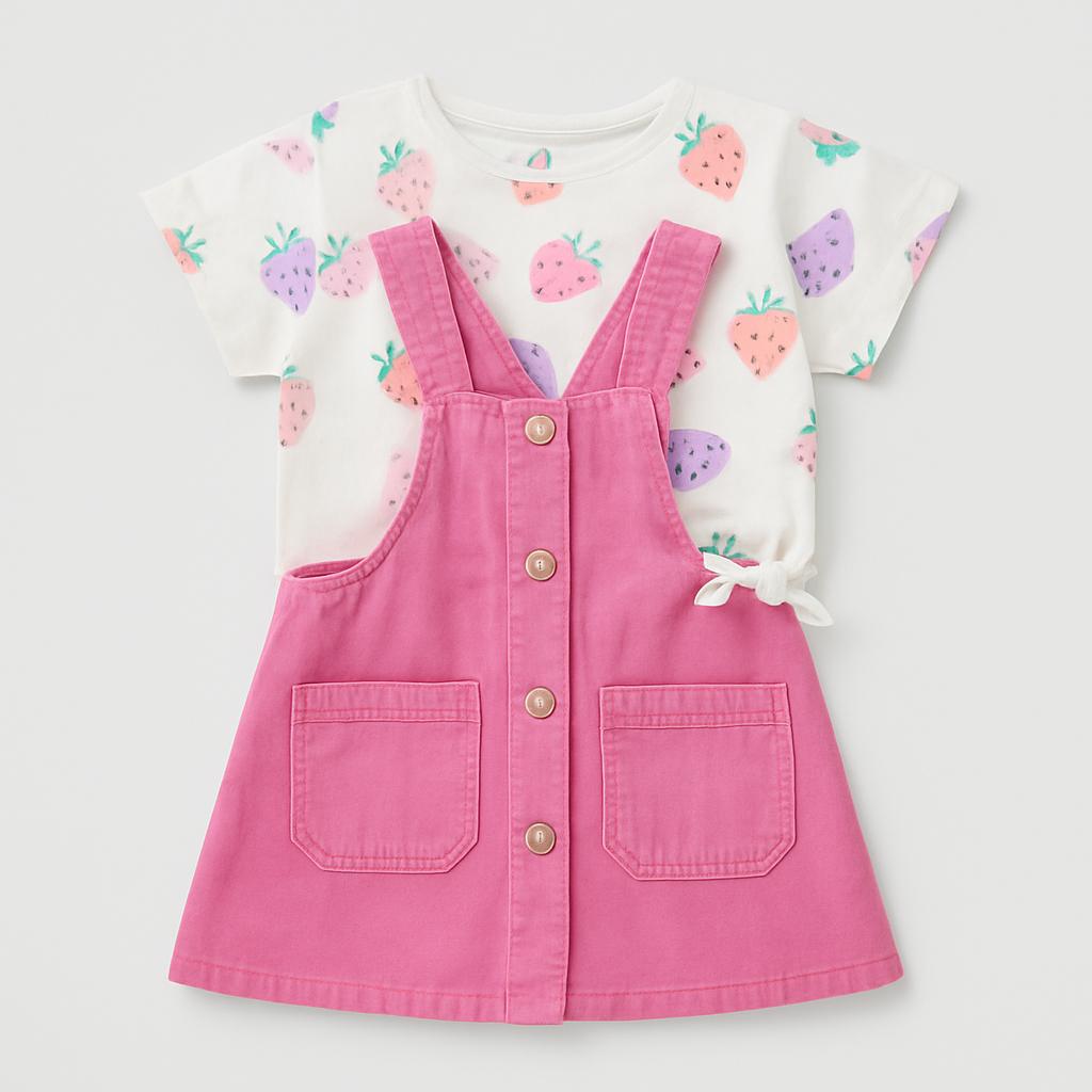 Questo adorabile set per bambini è perfetto per le piccole amanti della frutta e dello stile! La maglietta presenta un vivace motivo di fragole e lamponi, perfetta per aggiungere colore e allegria a qualsiasi look. Realizzata in morbido cotone, è comoda e fresca per le giornate di sole. In abbinamento, la salopette rosa è un classico senza tempo, con pratici bottoni frontali e tasche che rendono questo outfit sia pratico che stiloso. Anche se usati, entrambi i capi si presentano in ottime condizioni, pronti a regalare tante avventure estive!