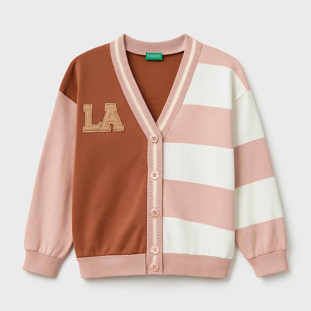 Questo adorabile cardigan riporta un'atmosfera calda e accogliente! Con le sue strisce rosa e crema, si fa notare grazie al suo design originale e moderno. La parte sinistra presenta una morbida sfumatura marrone, arricchita da una graziosa applicazione "LA" che aggiunge un tocco urbano. Le maniche puff offrono un look trendy e femminile, mentre i bottoni frontali garantiscono praticità per le piccole avventuriere. Nonostante sia un capo usato, è in buone condizioni e pronto a diventare il punto di forza di qualsiasi outfit, perfetto per le fresche giornate di autunno o le passeggiate primaverili!