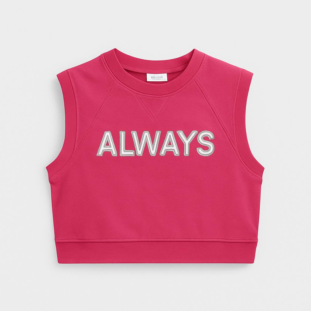 Questo adorabile top rosa, con l'applicazione "ALWAYS" in bianco, è perfetto per le piccole trendsetter! Realizzato in morbido cotone, il design senza maniche garantisce comfort e freschezza. Il taglio corto lo rende ideale per abbinamenti con gonne e pantaloni a vita alta, perfetto per avventure estive o giorni di gioco. Nonostante sia un capo usato, è in ottime condizioni e pronto per regalare stile e allegria a ogni outfit. Un must-have per ogni giovane fashionista!