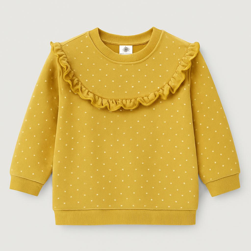 Questa adorabile felpa gialla è un vero capolavoro per il guardaroba della tua bimba! Realizzata in morbido cotone, presenta una deliziosa fantasia a pois bianchi che porta un tocco di allegria. I dettagli arricciati sulle spalle aggiungono una nota romantica e giocosa, rendendola perfetta per qualsiasi occasione. Le maniche lunghe garantiscono comfort e calore, ideali per le giornate fresche. Nonostante sia un capo usato, si trova in ottime condizioni, pronto a essere indossato da una piccola stilista! Un must-have per un look trendy e sofisticato!