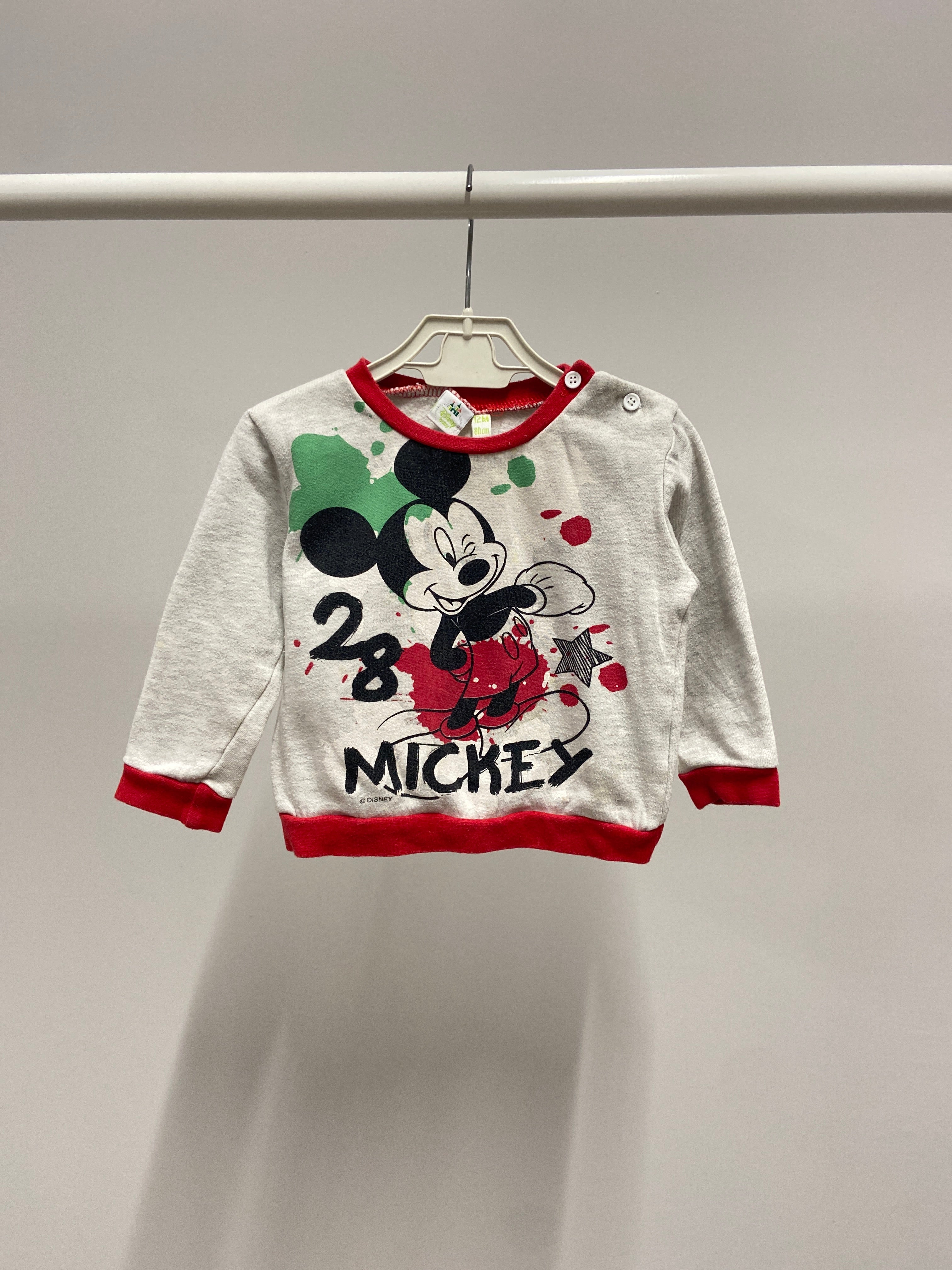 Questo adorabile maglione è un tributo al mitico Topolino! Realizzato in morbido cotone, presenta un design grigio chiaro con dettagli rossi che incorniciano il collo e i polsini. La protagonista è una colorata stampa di Mickey Mouse, che sprizza allegria con colori vivaci e un tocco di creatività. Perfetto per le fresche giornate primaverili o autunnali, questo capo è ideale per vestire i piccoli in modo divertente e confortevole. Nonostante sia usato, si trova in ottime condizioni e sarà sicuramente un successo tra i fan di Topolino!