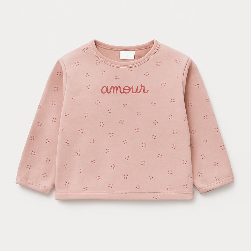 Questa dolce maglietta rosa è un adorabile capo per le piccole principesse! Realizzata in morbido cotone, offre comfort e praticità. Il delicato motivo di fiori e la scritta "amour" in un elegante tono bordeaux rendono il tutto ancora più speciale. Le maniche a tre quarti aggiungono un tocco trendy e versatile, perfetta per accompagnare ogni outfit. Anche se usata, si presenta in ottime condizioni, pronta a far brillare il guardaroba della tua piccola. Ideale per giochi, uscite o momenti di dolcezza in casa!