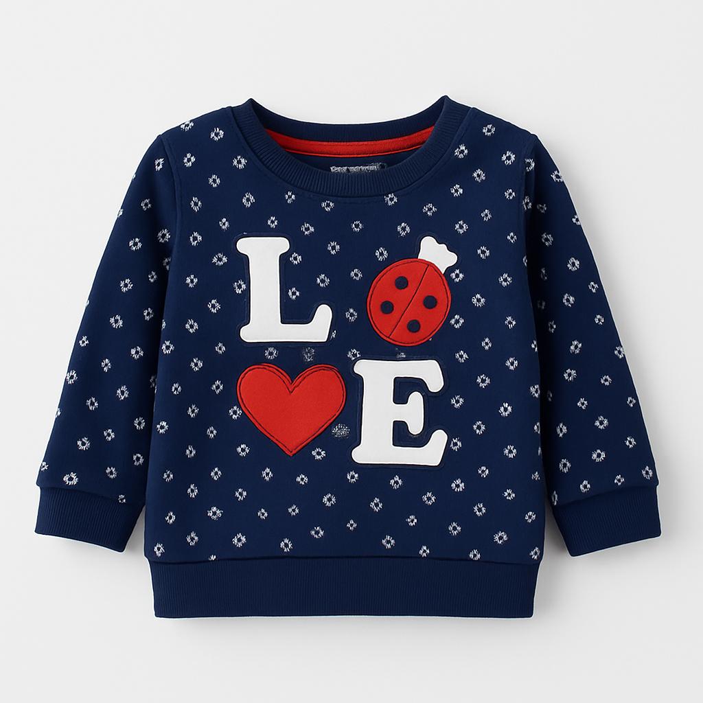 Questo adorabile pullover di marca Benetton è perfetto per le piccole romantiche! Realizzato in morbido tessuto, il suo caldo blu notte è decorato con graziosi dettagli floreali e una vivace scritta "LOVE" accompagnata da una simpatica coccinella rossa. Le maniche lungo sono ideali per le fresche giornate, mentre il design comodo permette libertà di movimento. Sebbene sia un capo usato, si presenta in ottime condizioni, pronto a regalare comfort e stile alla tua piccola. Un must per un look dolce e giocoso!