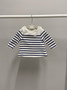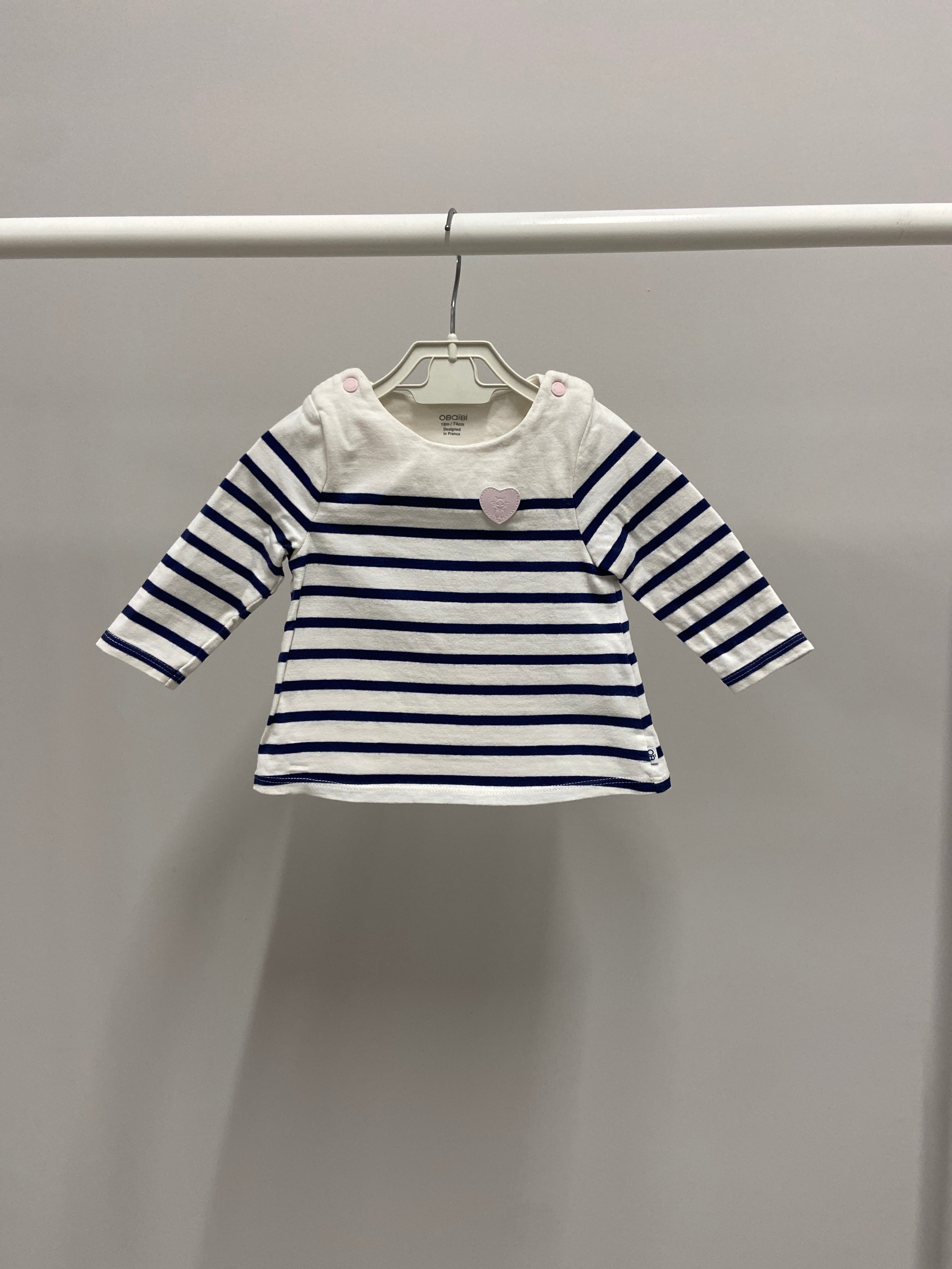 Questa adorabile maglietta a righe è perfetta per le piccole fashioniste in ogni occasione! Realizzata in morbido cotone, presenta righe bianche e blu navy che donano un tocco di eleganza e freschezza. Le maniche lunghe la rendono ideale per le fresche giornate, mentre il delicato cuoricino rosa sul petto aggiunge un tocco di dolcezza. I bottoncini sulle spalle facilitano la vestibilità, rendendola pratica e comoda. Nonostante sia un capo usato, è in ottime condizioni e pronta per nuove avventure! Un must-have per ogni guardaroba infantile!