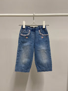 Questi adorabili jeans per bambini sono un'aggiunta fantastica al guardaroba delle piccole fashioniste! Realizzati in denim di alta qualità, presentano un wash chiaro che dona un tocco fresco e primaverile. I dettagli floreali ricamati sulle tasche e il bordo in pizzo aggiungono un pizzico di femminilità e originalità. La vita elastica garantisce una vestibilità comoda e pratico movimento durante il gioco. Nonostante siano usati, si presentano in ottime condizioni, pronti per affrontare nuove avventure! Un paio di jeans che unisce comfort e stile, perfetto per ogni occasione!