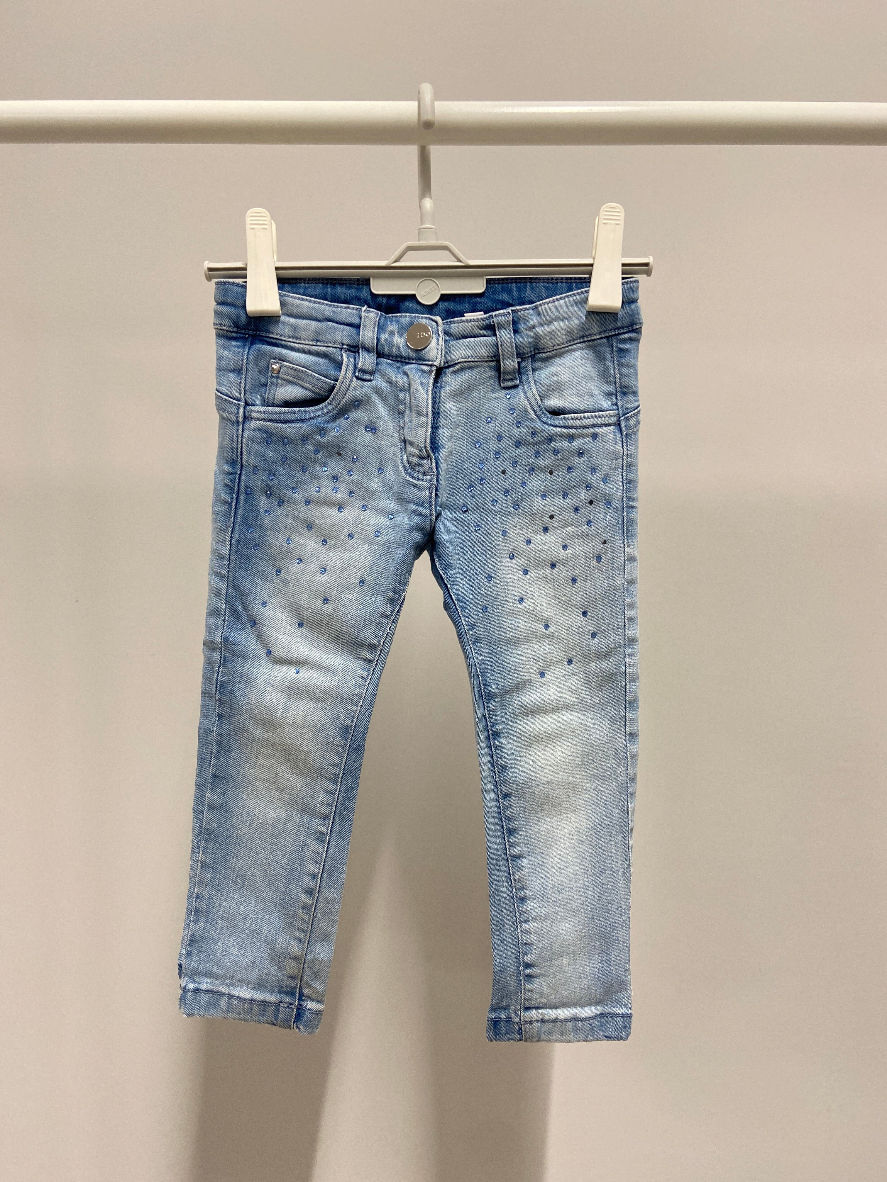 Questi adorabili jeans skinny in denim chiaro sono perfetti per le piccole stiliste in erba! Il design elegante è arricchito da delicati applicazioni di strass che donano un tocco di brillantezza e originalità. La vestibilità attillata assicura comfort durante le avventure quotidiane, mentre il tessuto elasticizzato consente una libertà di movimento ottimale. Sono ideali per essere abbinati a t-shirt colorate o a felpe trendy. Anche se usati, si presentano in ottime condizioni, pronti a far brillare il guardaroba della tua bambina!