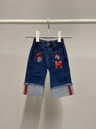 Questi adorabili pantaloni in denim cavalcano l’onda della moda infantile! I jeans presentano un originale design con toppe ricamate che celebrano il mondo di Minnie, portando un tocco di magia nel guardaroba del tuo bambino. Il taglio cropped con orli sfrangiati aggiunge un’ottima dose di stile, mentre le strisce colorate sui lati offrono un sapore vivace e frizzante. Ideali per ogni avventura quotidiana, questi jeans usati sono in ottime condizioni e pronti a vestire il tuo piccolo con comfort e fantasia! Un capo essenziale per ogni piccola fashionista!