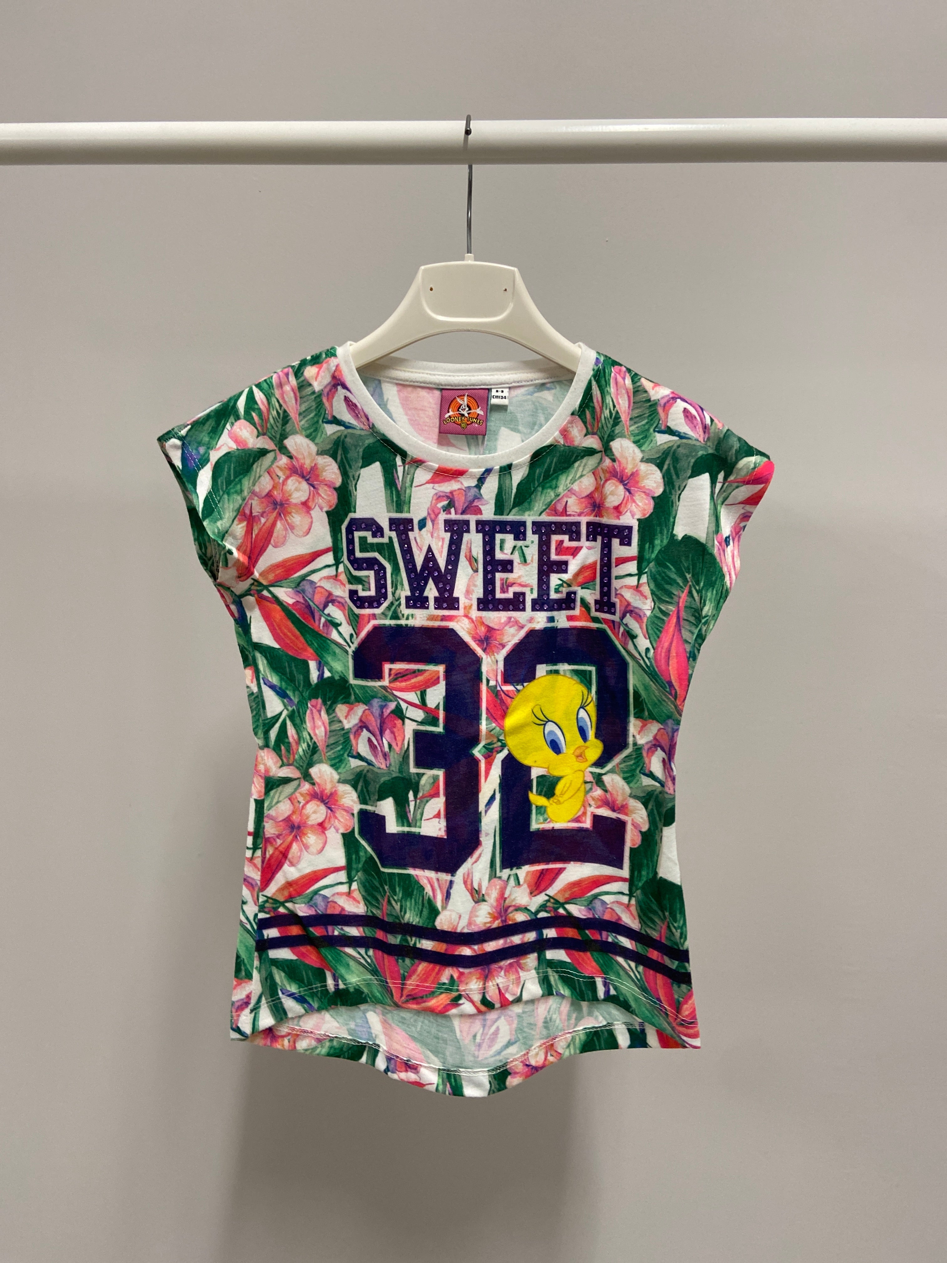 Aggiungi un tocco di allegria al guardaroba della tua bambina con questa vivace t-shirt "Sweet 32"! Realizzata in una morbida fibra, questa maglietta presenta una coloratissima stampa floreale che cattura l’attenzione. Il grande numero 32, decorato con un adorabile Tweety, conferisce un tocco di originalità e divertimento. Le maniche corte e il taglio ampia garantiscono comfort e libertà di movimento, perfetti per le avventure estive. Sebbene sia un capo usato, la t-shirt si presenta in ottime condizioni, pronta per essere indossata con stile e spensieratezza da ogni piccola esploratrice!